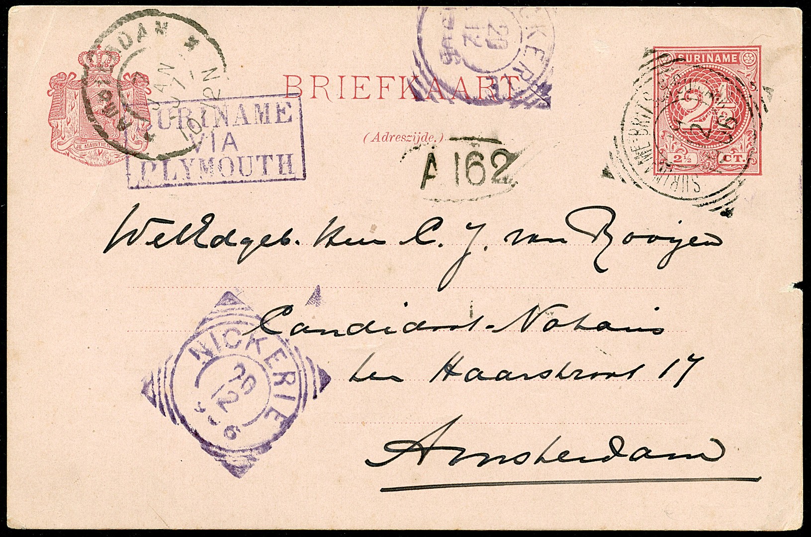 SURINAME-BRITSCH-GUIJANA op bk. G11 (mist klein stukje uit rechter rand) van 19-12-1906 over Nickerie 20-12 (blauwe afst.) via Plymouth (zelfde kleur blauw) naar een candidaat-notaris te Amsterdam 7-1-1907
