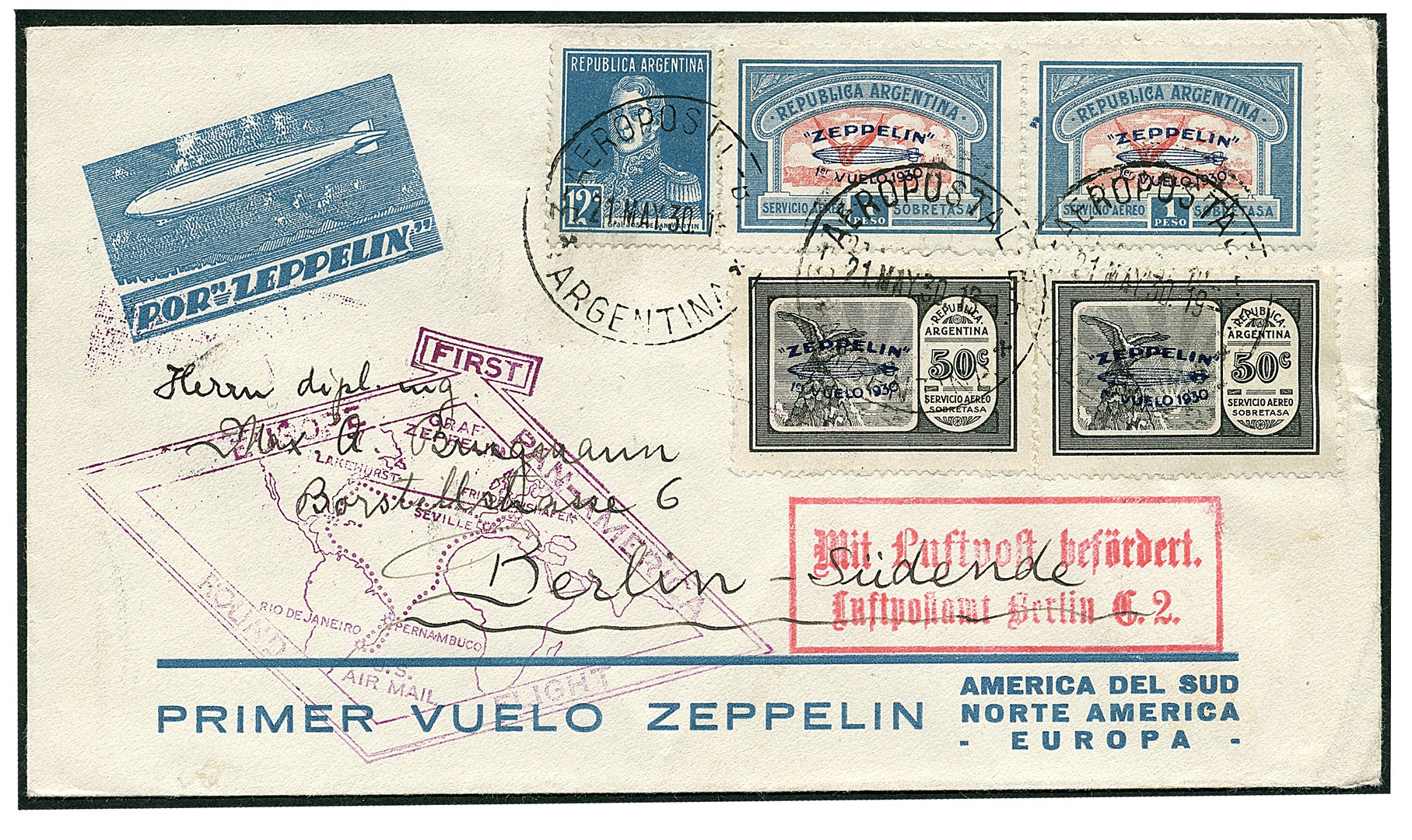Zeppelinpost. Argentinië. Zuid-Amerikavaart 18-5/6-6-1930 o.a. gefr. met Mi.338/339 in paren (12c zegel is verschoven), via Friedrichshafen 6-6 naar Berlijn 7-6. S.63