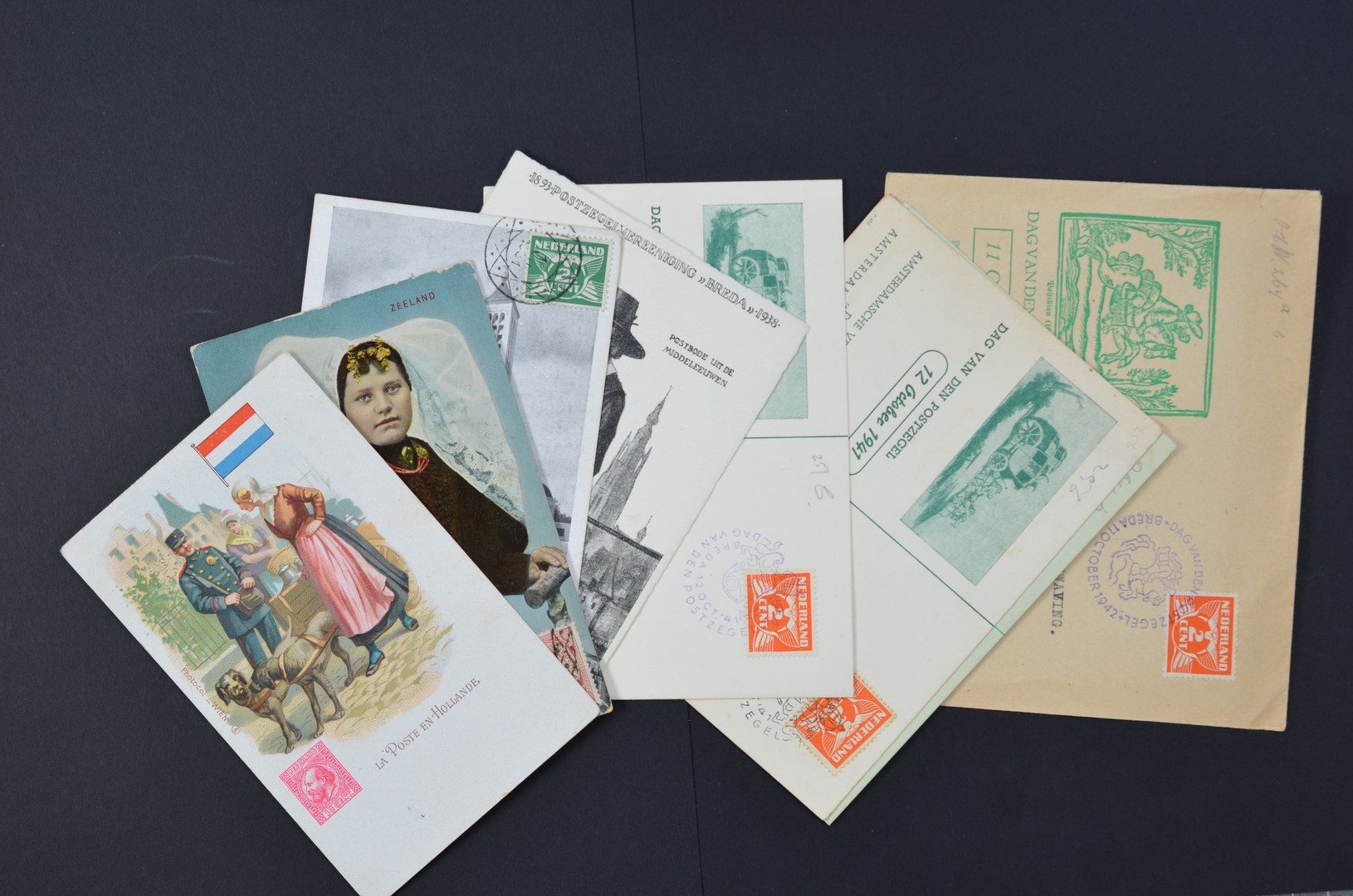 POSTHISTORIE, 9 Poststukken met stempels van Autopostkantoor, 5 Dag van de Postzegel 1938-42, 2 mooie prentbk. alsmede 2 prentbk. naar België uit 1907 en 1931 waarvan de zegels met Belgisch stempel voor ongestempeld gebleven stukken is gestempeld