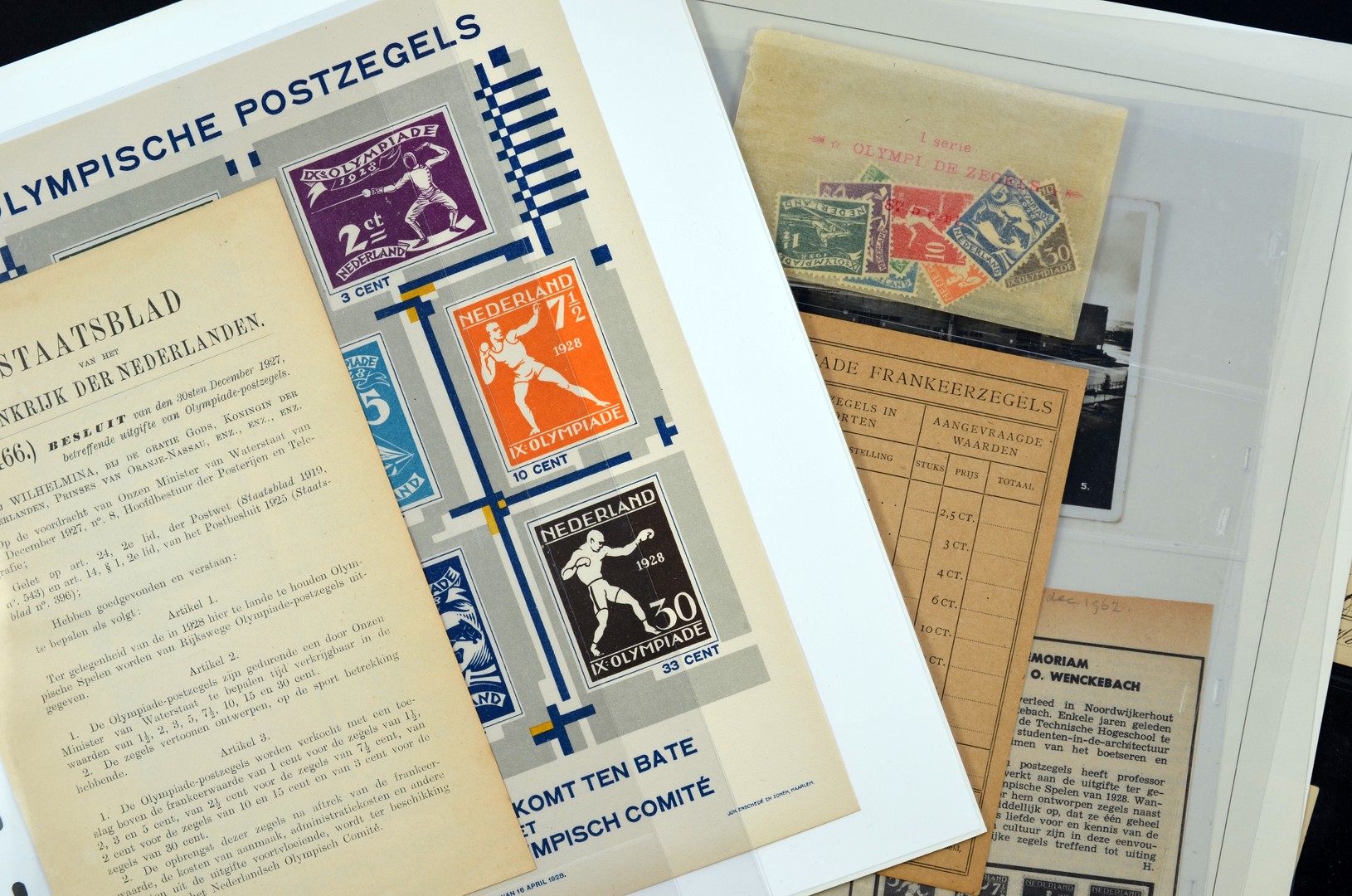 Olympische Spelen 1928, Staatsblad betreffende de uitgifte, bijlage NMPh, bestelkaart van Dienst PTT, postfrisse serie is speciaal daarvoor bedrukt pergamijnzakje, fotokaart tijdelijk bijpostkantoor en twee briefkaarten met Olympisch stempel N1 en N2