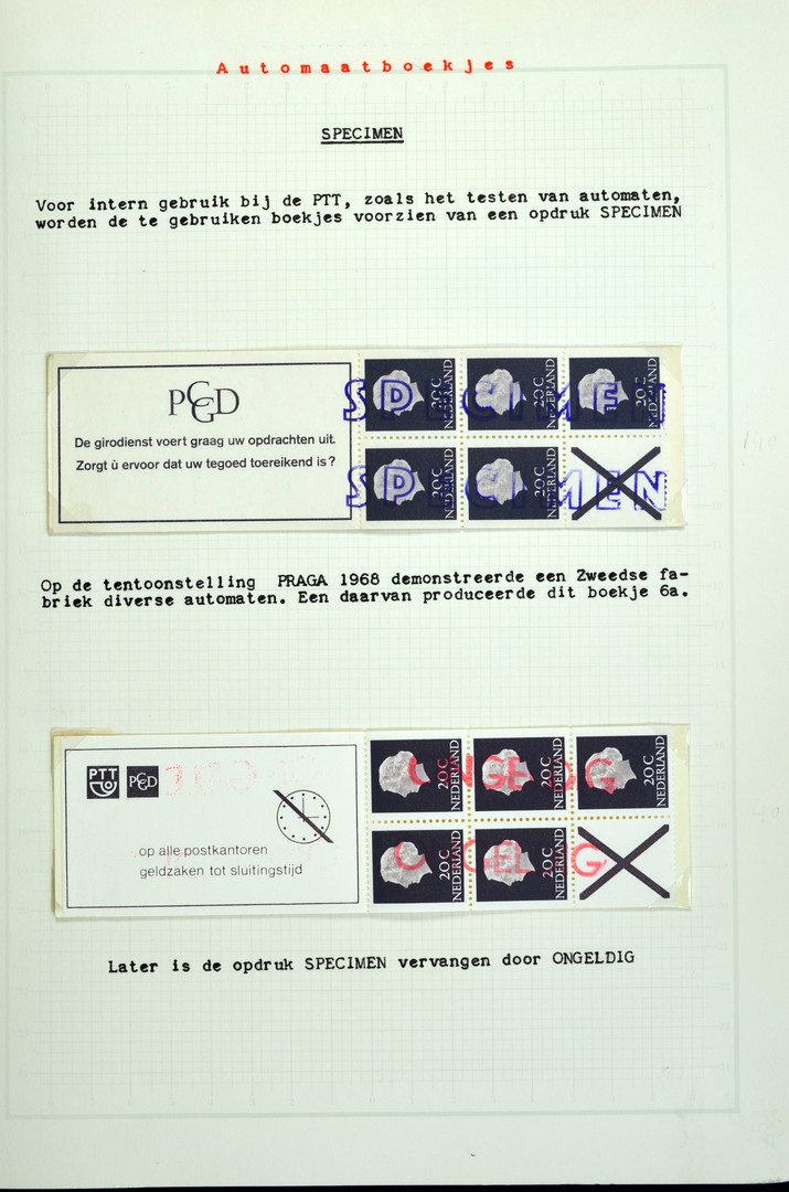 Automaatboekjes, gespecialiseerde verz. wb. verschoven zegel-beelden, opdruk Specimen en Ongeldig, Rakelstrepen, Plaatfouten en o.a. boekje 3 met kwartslag gedraaid telblokje. Hoge waarde!
