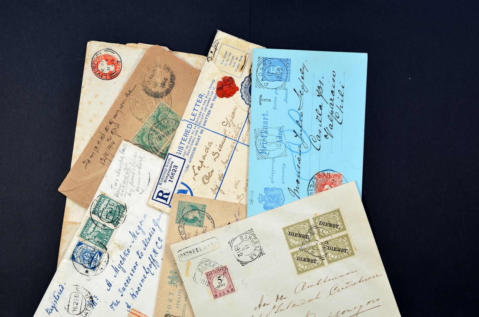 NED.- INDIË POSTHISTORIE, 19 betere poststukken 1893-1946 w.o. incoming mail, postagenten, Republiek briefkaart met veldpoststempel ´131´, APO te Morotai, etc.