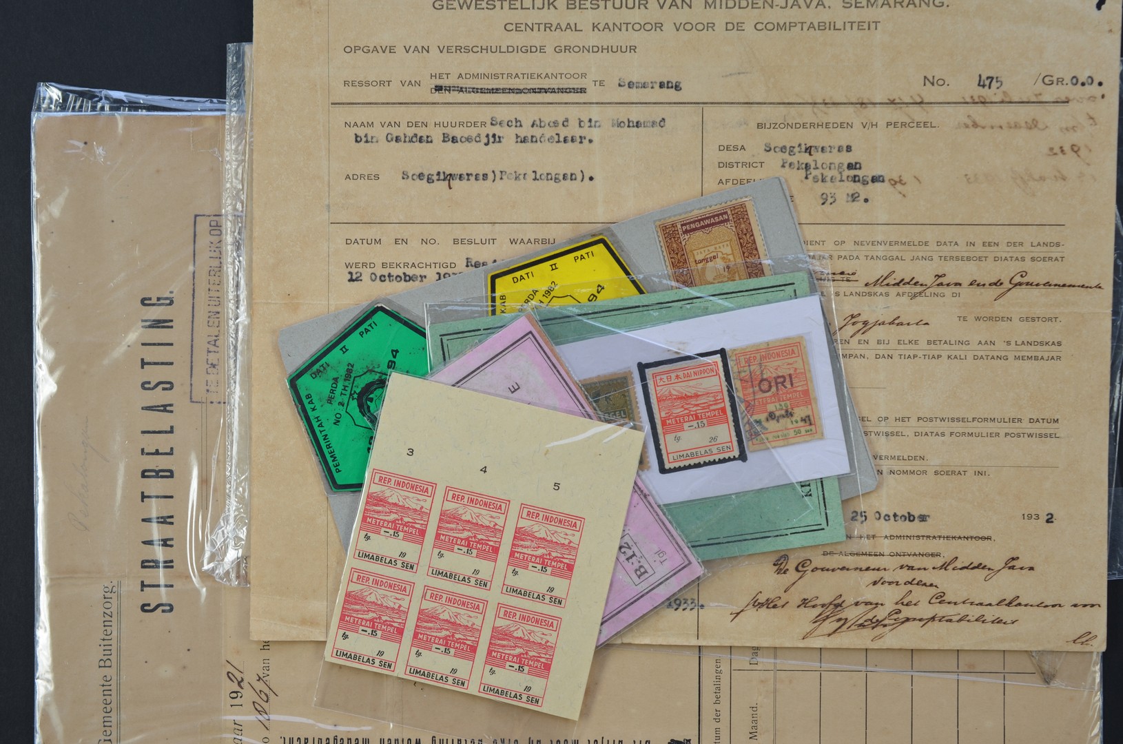 NED.- INDIË & INDONESIË, fiscaal, partijtje documenten vanaf ca. 1916 w.o. met fiscaalzegels, meest in wat tropische kwaliteit