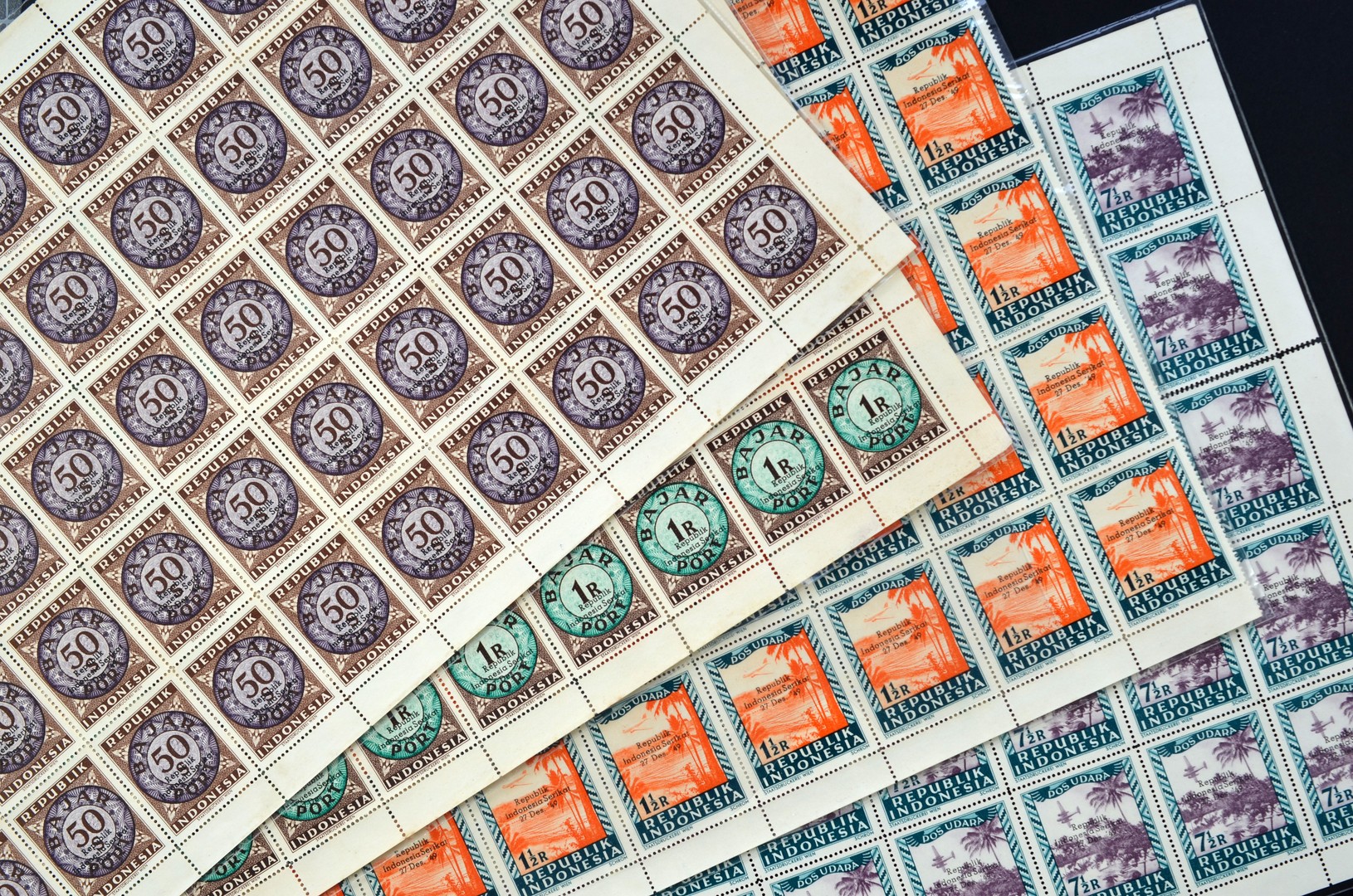 INDONESIA, Vienna Printings, Republik Indonesia Serikat overprints on complete sheets of 50 stamps Air Mail 1½R and 7½R nos. 44-08 and 44-10 (both left sheet margin missing, 1 1½R stamp damaged) and Postage Dues 50s and 1R nos. 47-11 and 47-13. Cat value ? 3237,50