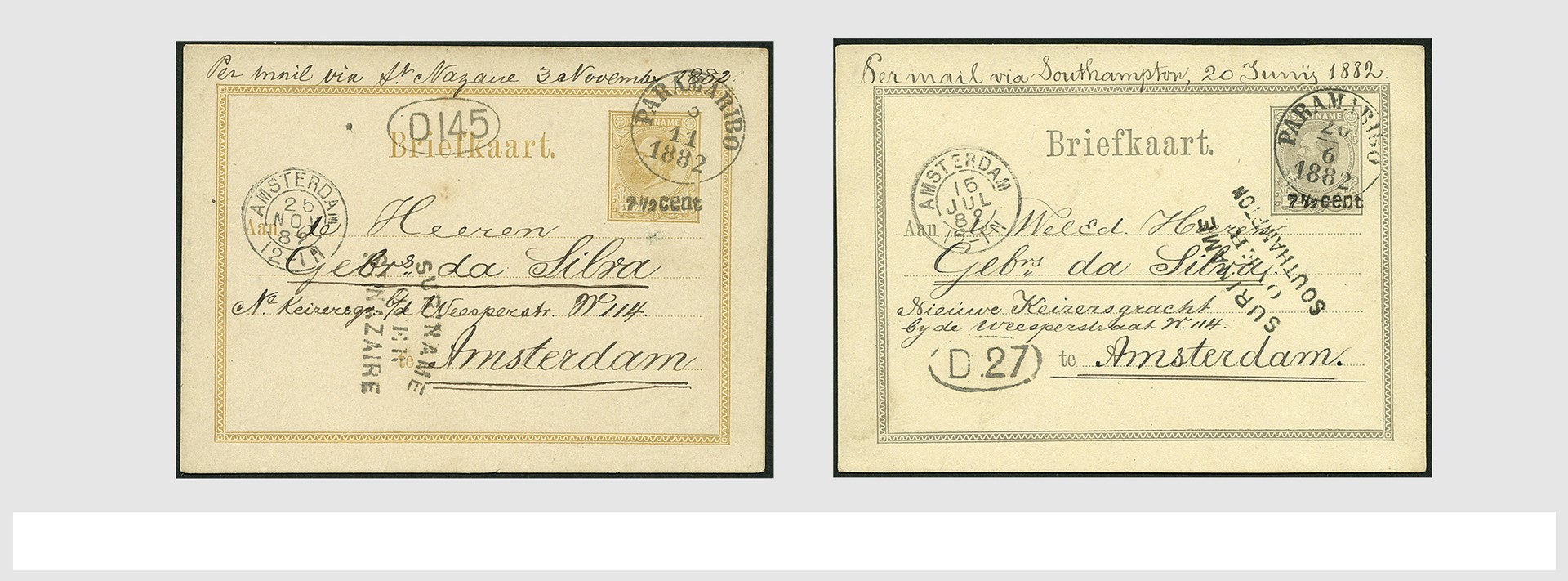 SURINAME, tien poststukken 1882-1907 waarop routestempels (Havre 1x, Plymouth 4x, Southampton 2x, St. Nazaire 2x en rechtstreeks 1x)