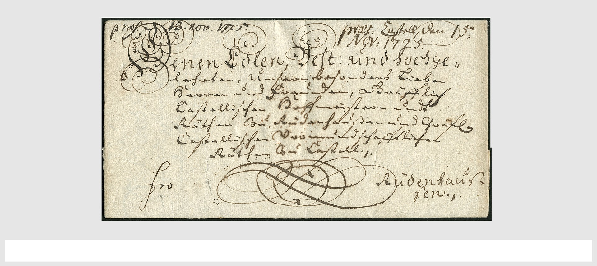 DUITSLAND POSTHISTORIE, drie prachtige, in sierlijk handschrift geschreven complete zogeheten ´Snörkelbriefe´ uit 1725, 1734 en 1743 (´groter, breder, vorstelijker´), incl. literatuur