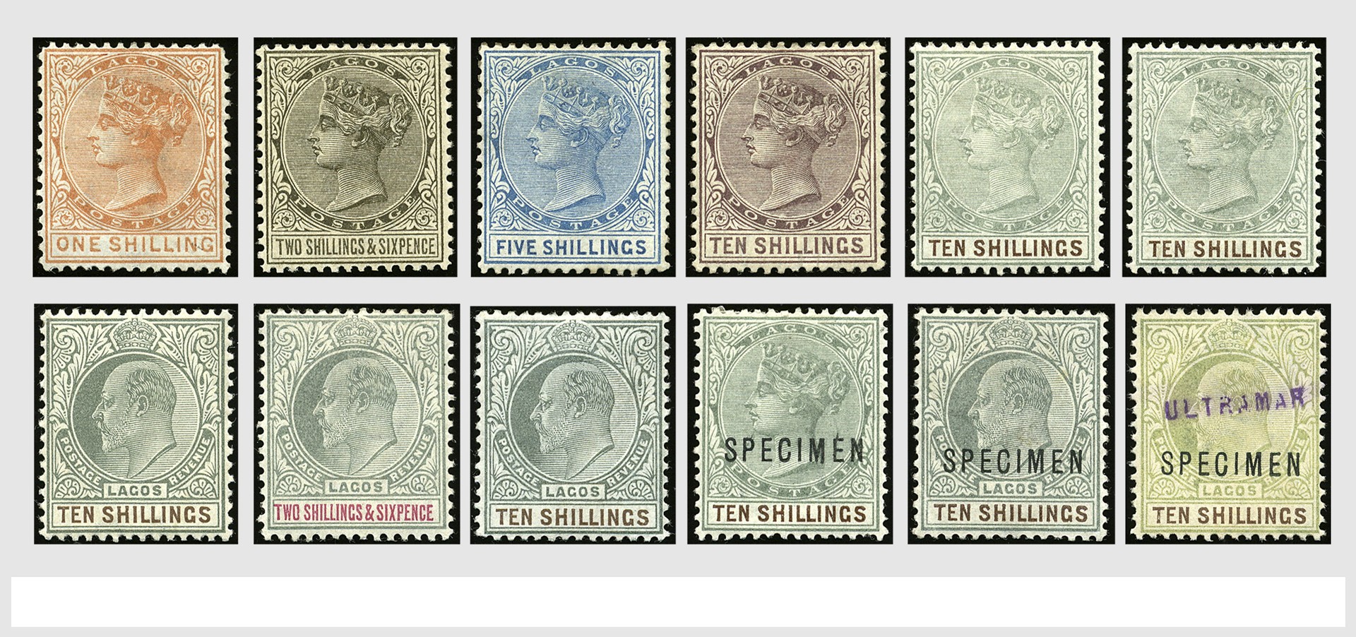 ENGELSE KOLONIËN, Lagos 1874-1906, o/* verzameling op insteekbladen met veel goede nrs. o.a. S.G. 16, 27/29 (!) £.2600, 30/41, 41, 51, 63 (2), 30/41 Specimen, 44/53 Specimen