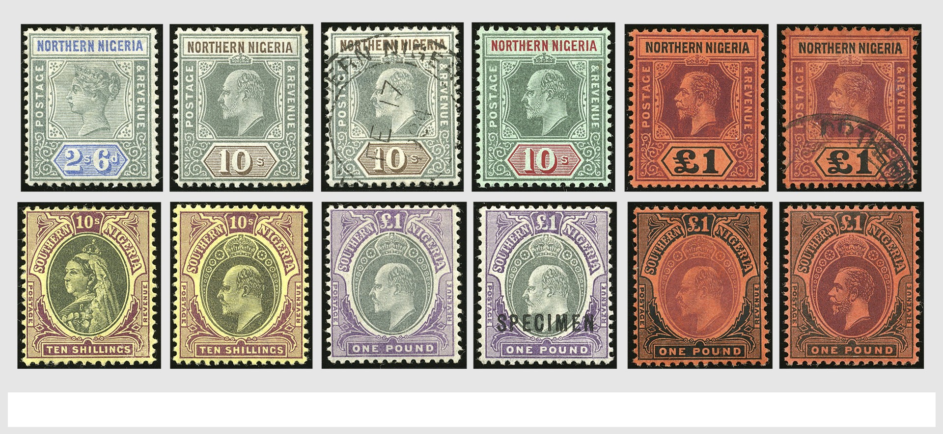 ENGELSE KOLONIËN, Noord en Zuid Nigeria, o/* verzameling op insteekbladen met vele goede series o.a. Noord Nigeria S.G. 8, 28/39, 40/52, Zuid Nigeria S.G. 1/9, 1/9 Specimen, 18/19, 31/32, 29/32 Specimen, 33/43, 45/56, etc. Mooie koop!