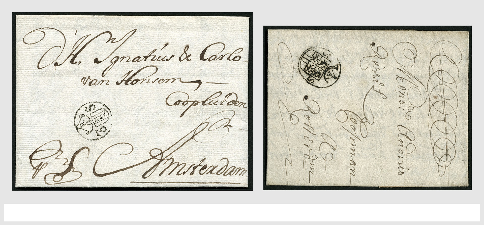 POSTHISTORIE, 28 prachtige vouwbrieven 1595-1784 waarvan 13 met 3-stuiverstempels met A, H of G, kasteleinsbrieven, geschreven ´D´hulst´ (1767), naar Corsini in Londen, diverse notities, alles in de mooist mogelijke kwaliteit, gedocumenteerd beschreven op bladen in Lindner ringband