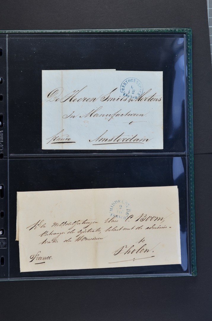POSTHISTORIE, ca. 45 poststukken zonder postzegels, afgestempeld met halfrond-francostempels typen A, B en C in zwart of blauw, in Leuchtturm ringband