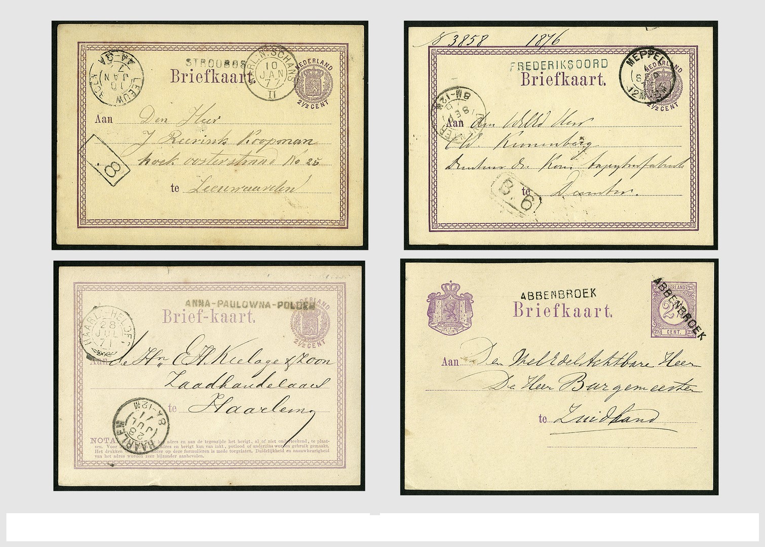 POSTHISTORIE, ca. 80 poststukken met naam/langstempels in schreefletters en schreefloze letters, diverse kleuren, met veel mooie afstempelingen w.o. van kleine kantoren, in Leuchtturm ringband