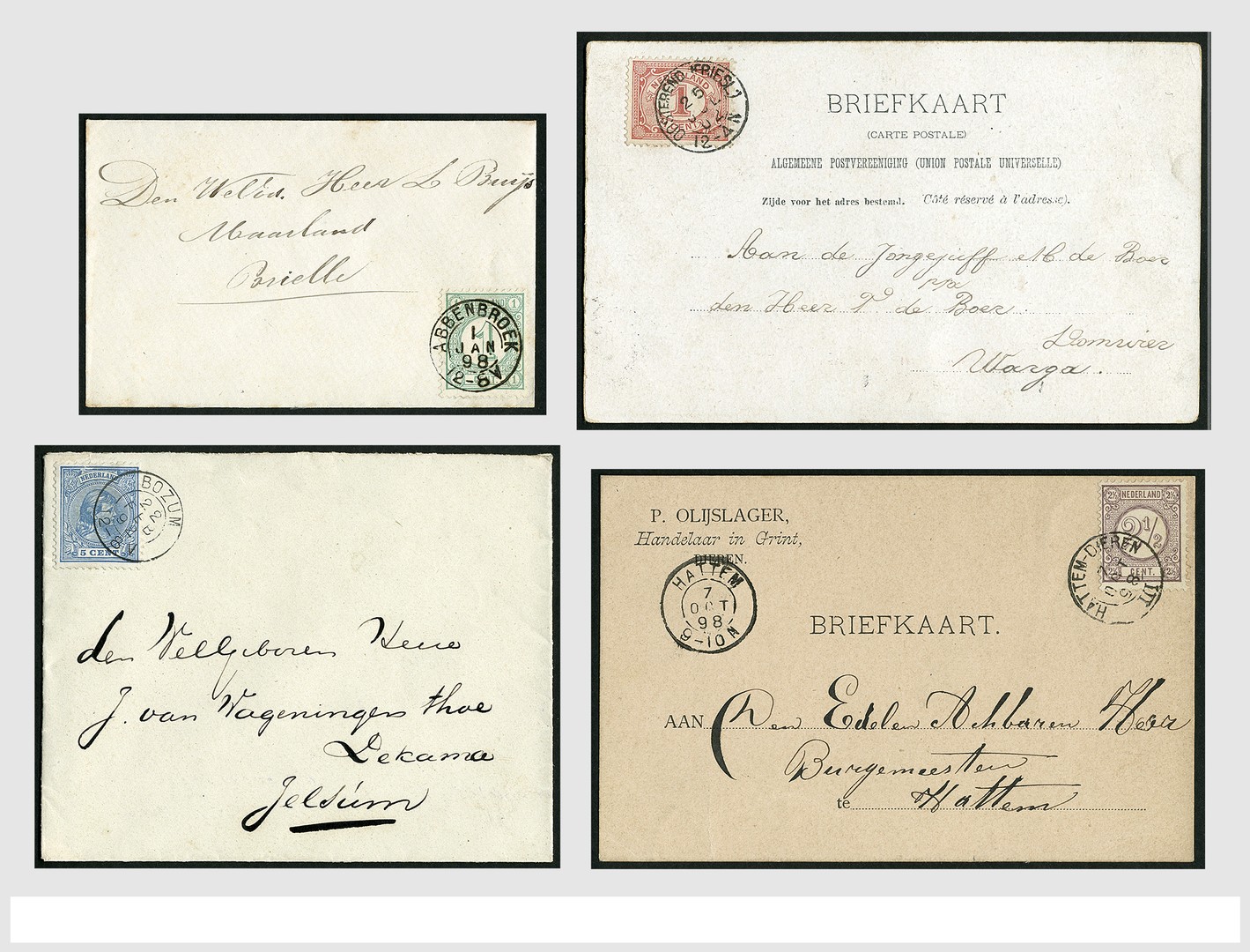 POSTHISTORIE, ca. 150 poststukken (met zegels gefrankeerde poststukken en briefkaarten) met kleinrondstempels waarvan veel van (kleine) hulp- en bijpostkantoren, tevens van stations, spoorwegtrajecten, Amsterdam E, Queenborough-Vlissingen (superbe op 2 poststukken), w.o. eveneens diverse met naam- en haltestempels, in 2 Leuchtturm ringbanden
