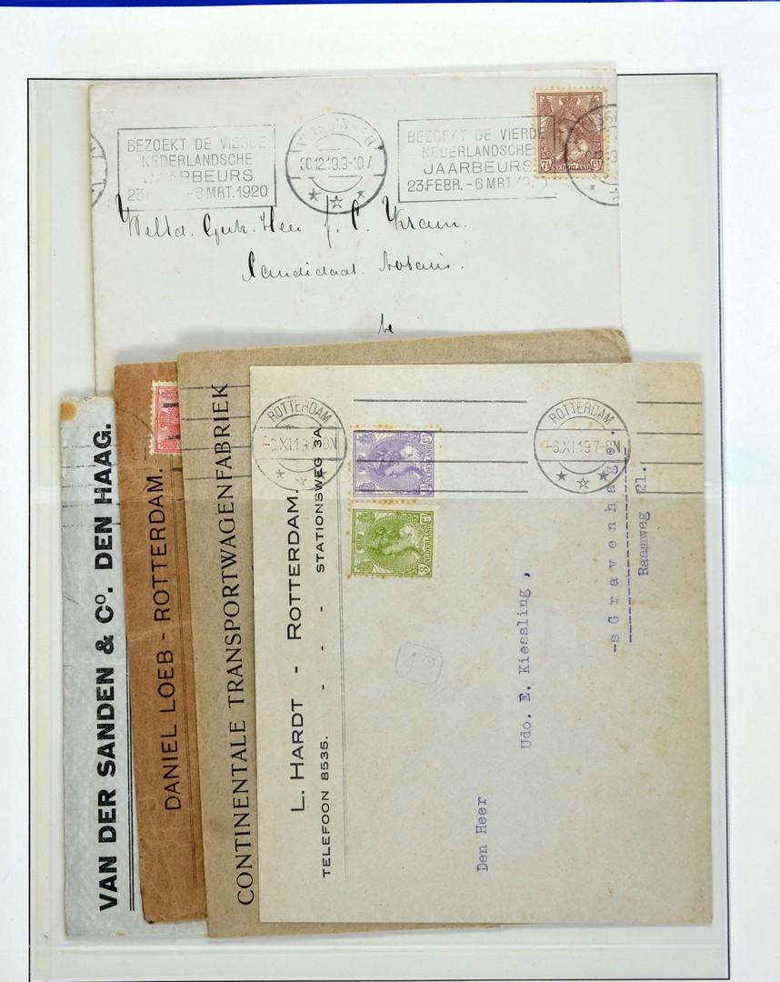 POSTHISTORIE, Machinestempels (electrische en continuerende) op ruim 410 poststukken vanaf 1904 gefrankeerd met emissies Vürtheim en/of Bontkraag, w.o. van verschillende kantoren, met reclames, proefstempels, geheel of gedeeltelijke blinddruk, verticale afstempelingen, (enkel)frankeringen, tarieven, bestemmingen, prachtige firmacouverts, etc. alsmede op losse zegels, meeste afstempelingen in pracht- of luxe kwaliteit, in 4 Lindner-ringbanden. Prachtobject als studiemateriaal (typen, data, etc.), op te zetten en uit te breiden