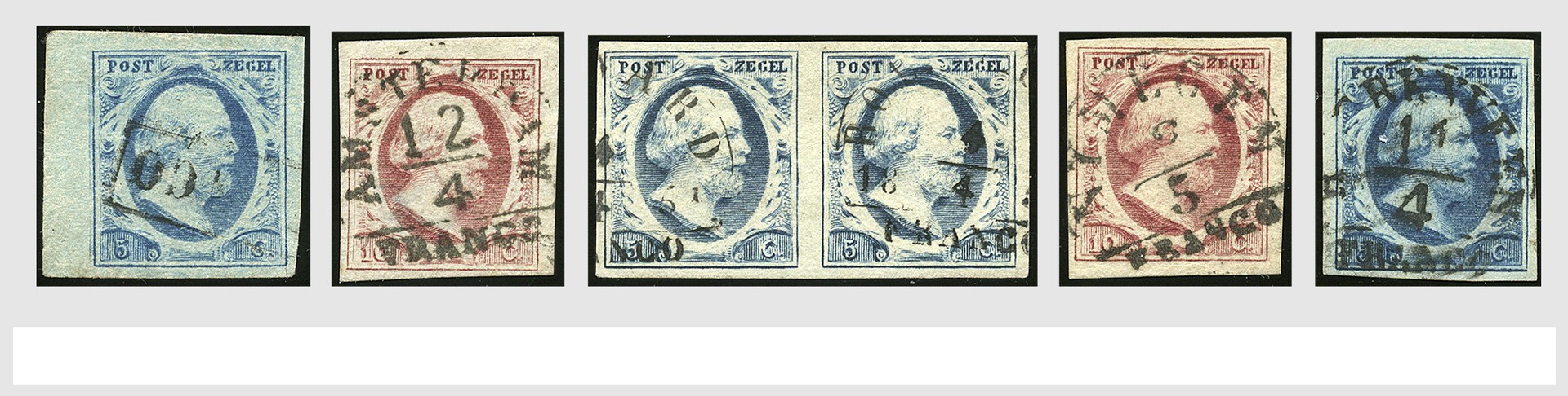 Emissie 1852 met PC9, de zwarte kartonproef, 5 cent blauw (81 en 1 paar), 10 cent rood (69 en 1 paar), in insteekboek