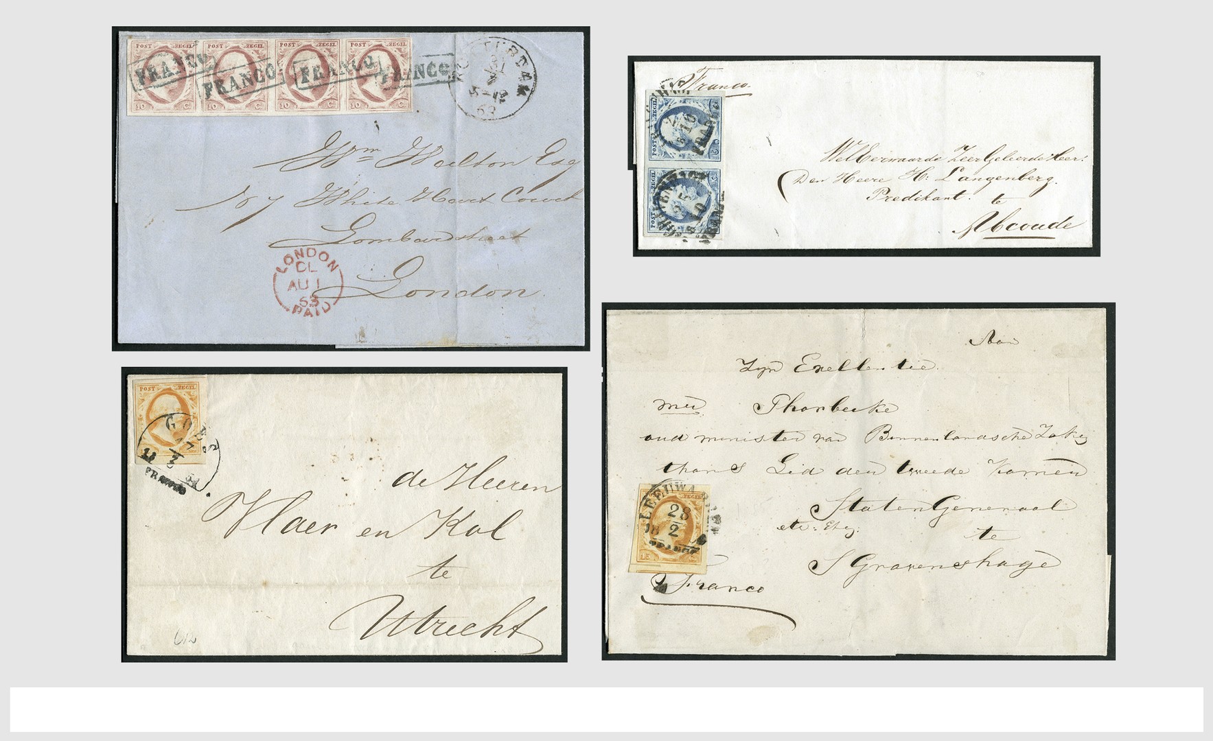 EMISSIE 1852, 61 veelal frisse vouwbrieven/briefomslagen gefrankeerd met 5 cent (16x los, 2x paar en 1x twee losse ex.), 10 cent (31x los, 2x strip van vier naar Londen, 1x twee losse ex.), 15 cent (5x los), 5c+10c (2x) en 5c+15c (1x), meest breed tot zeer breed gerande zegels w.o. rand- en hoekstukken, in Leuchtturm ringband