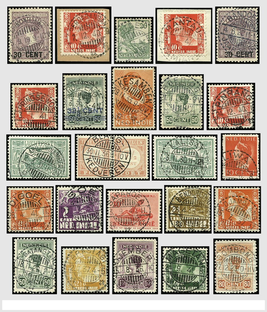 NED.- INDIË POSTHISTORIE, langebalkstempels op losse zegels w.o. veel prachtige afdrukken in diverse typen op verschillende emissies en waarden, ook wat uit de periode 1945-49, met schaarse tot zeer zeldzame kantoren zoals vooroorlogs Bandoeng/Jaarbeurs, Boeding, Hajoep, Karimondjawa, Liwa, (Moea)rasabak, Perdagangan, Rantau-/Tamiang, Srengat, Talangakar, etc. in dik insteekboek. Prachtobject om verder uit te breiden en op te zetten