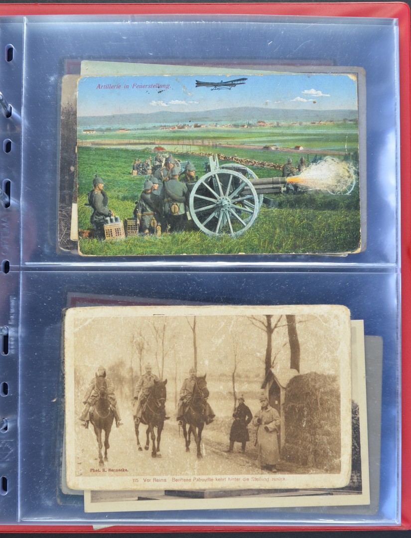 DUITSLAND ca. 1900-1918, ruim 90 (prent)briefkaarten w.o. veldpost Eerste Wereldoorlog, stempels, afbeeldingen van militairen, romantiek, Graf Zeppelin, etc. in Leuchtturm-ringband