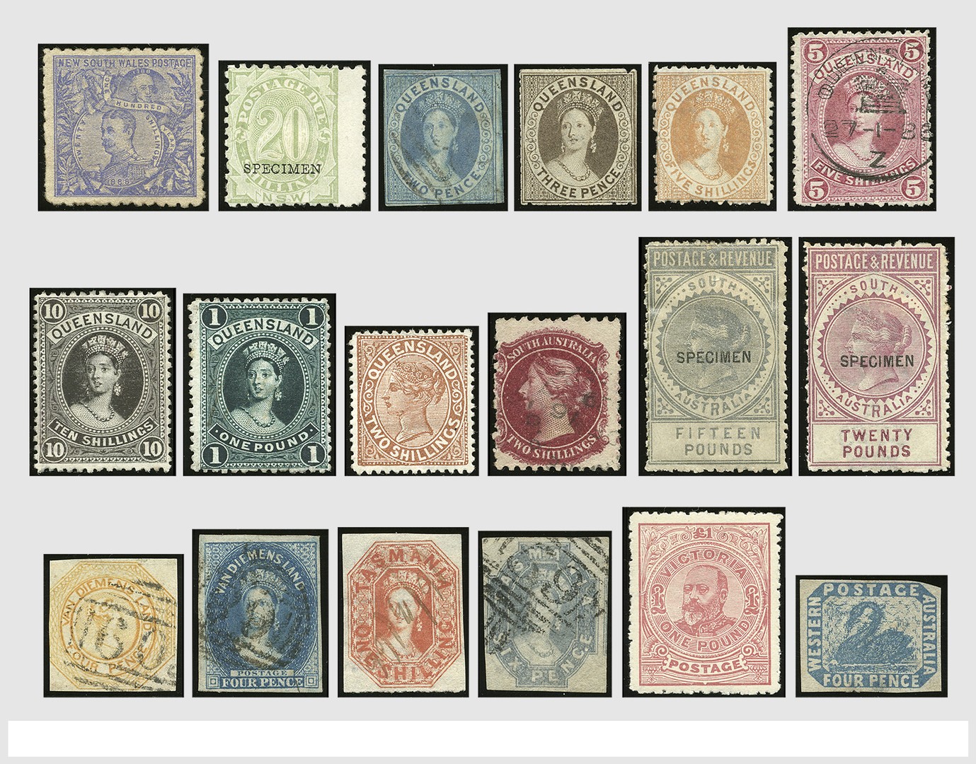 ENGELSE KOLONIËN, Australische Staten, uitgebreide verzameling o/* met veel kleur- en tandingvariëteiten, div. betere zegels, het geheel in wisselende kwaliteit (fraai tot pracht). Enorme cat.wrd.!