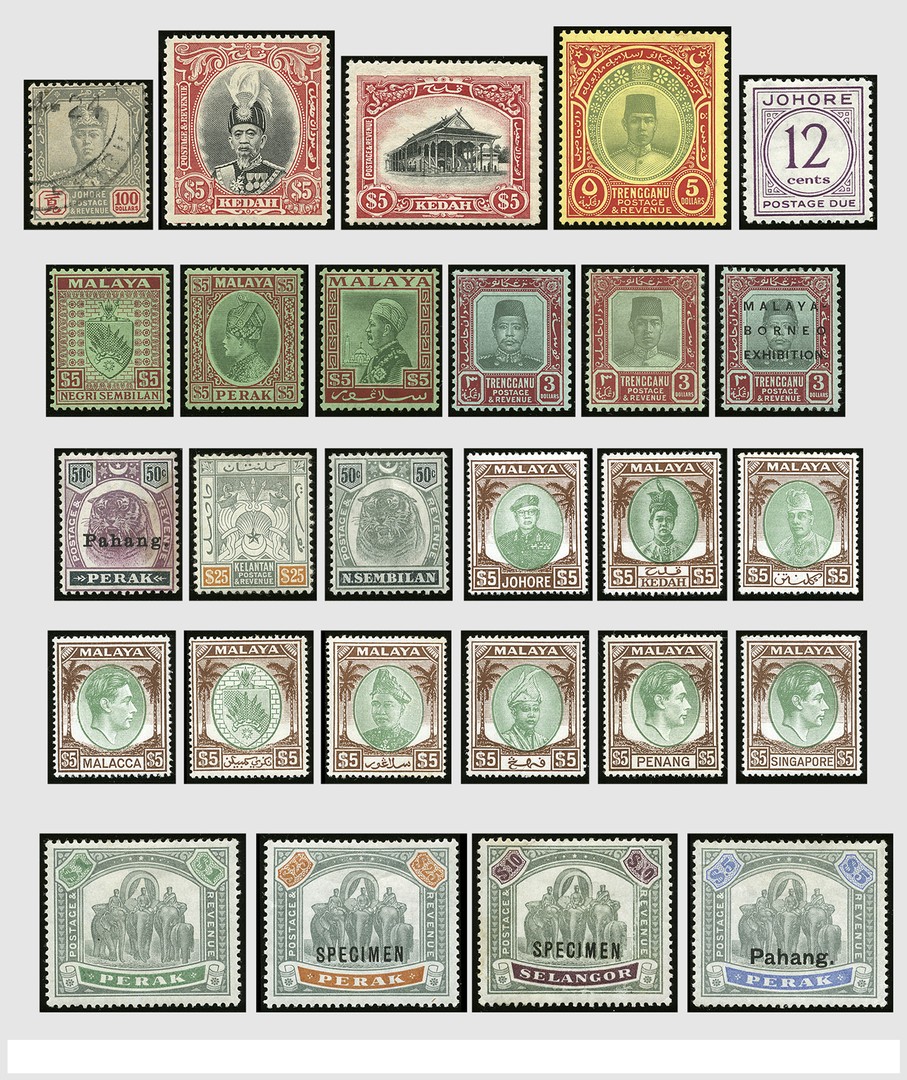 ENGELSE KOLONIËN, Maleise Staten 1880-1965, prachtcollectie o/*/** met van alle gebieden uitgebreid 1e emissie, opdrukken, verder o.a. Johore 77 (cert. RPS: Fiscaal), 145/47, Port 1/5, Kedah 1/14, 60/68, 88/90, Pahang 24 (!), £.1700,-, 44/46, 53/76, Perak 75/76, 88/102, Trengganu 16, 24, 44, 57, Perlis 7/27, Singapore 32, 51/52, etc. In 3 insteekboeken met emorme cat.wrd.!