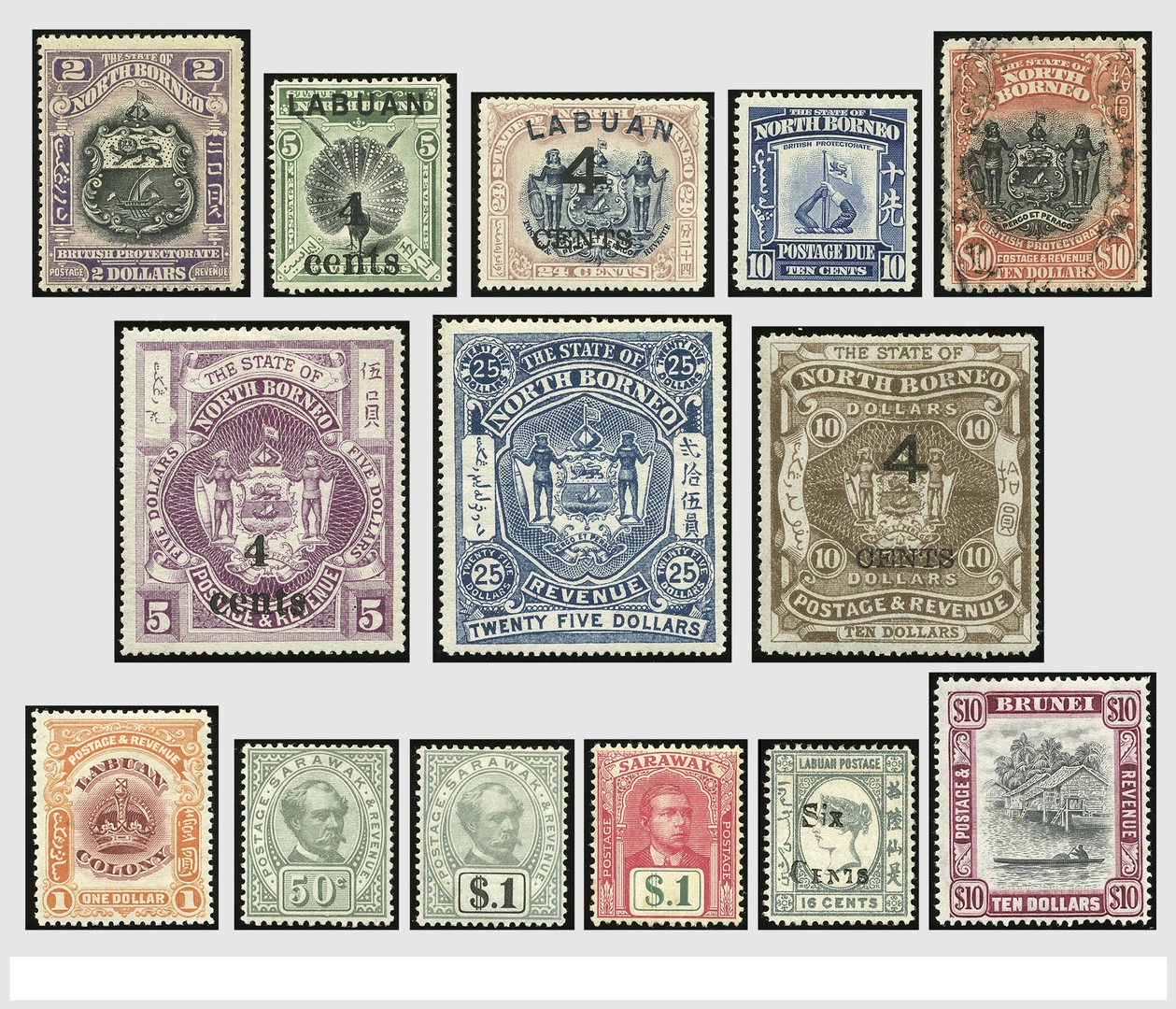 ENGELSE KOLONIËN, Noord Borneo, Brunei, Labuan, Sarawak 1869-1960, o/*/** verzameling in insteekboek met talloze betere nrs. o.a. Sarawak 8/21, Borneo 181, 183, Port 85/89, etc. Mooie koop met hoge waarde!