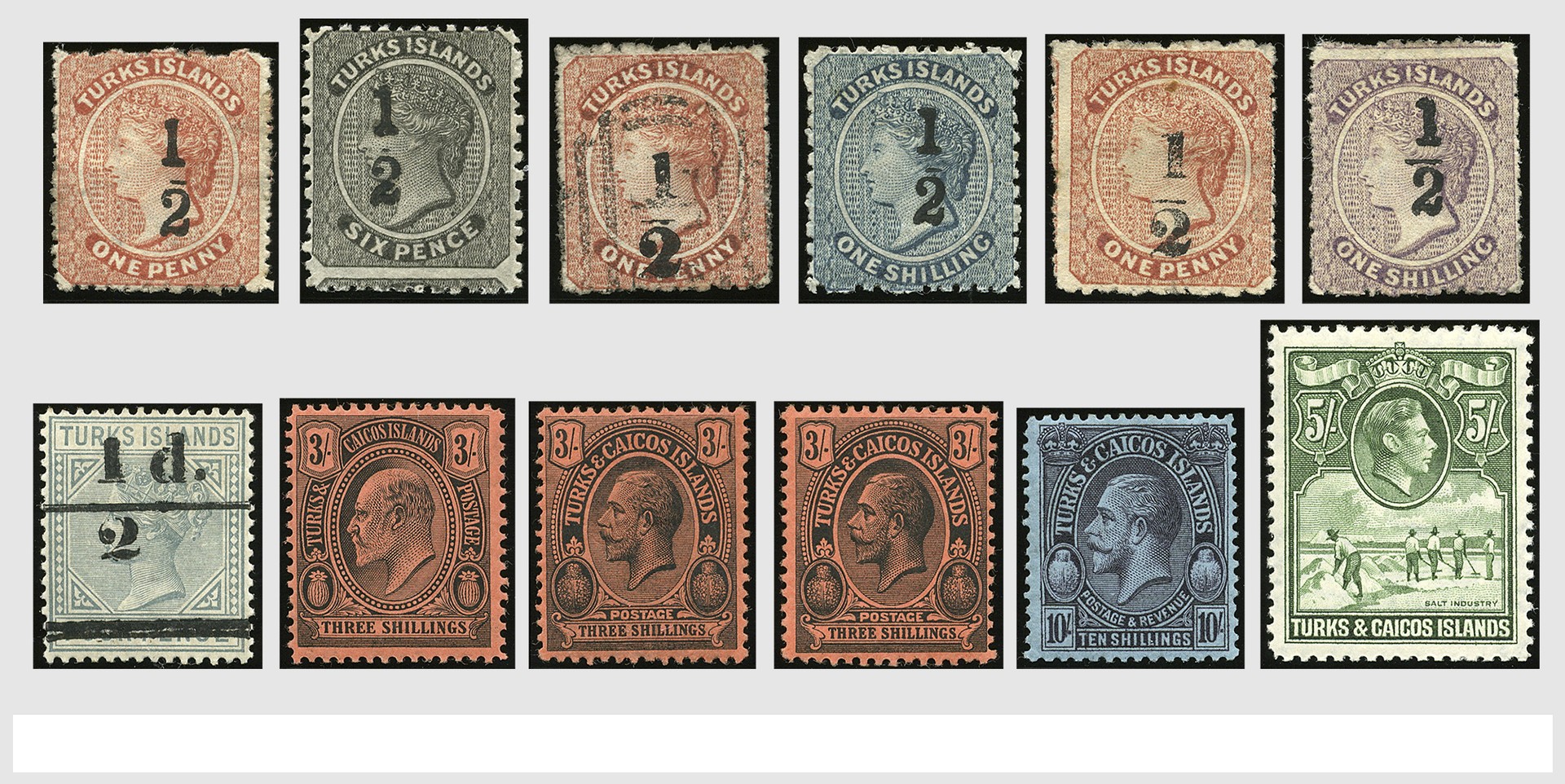 ENGELSE KOLONIËN, Turks en Caicos Eilanden, o/*/** verzameling op insteekkaarten, met een leuke selectie 1e emissies o.a. 6 '½'-opdrukken,, w.o. S.G.11b (cert. RPS 2017 cat.wrd. £.1500,-), 115/26, 176/86, 194/205, 221/33, 237/50, 253, etc.