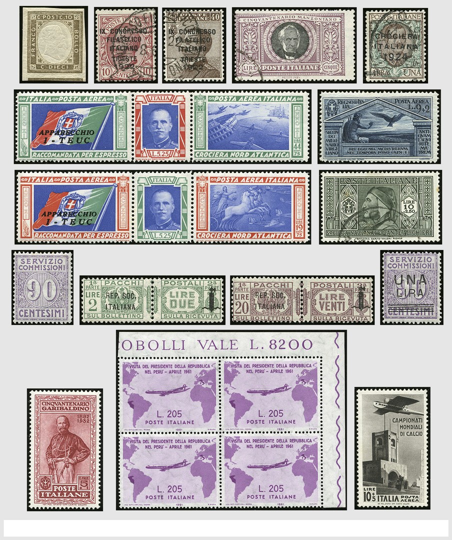 ITALIË 1861-1969, uitgebreide collectie o/*/** in dik Schaubek album, wb. div. goede klassieke nrs., 153/56 (gesign. Diena), Manzoni (oncontroleerbaar gestempeld), 361 op 1e vlucht-brief 15/12/1930 naar Rio de Janeiro, goede series 30-er en 50-er jaren, deels dubbel aanwezig en o.a. de 205 Lire uit 1961 in de violette kleur, zgn. 'Gronchi rosa' in postfris hoekrandblok van vier (€ 5600). Ook het Back of the Book gedeelte omvat vele betere nrs. Port, Pakketpost, Expresse, etc. Een uitzonderlijke prachtkoop met enorme cataloguswaarde!