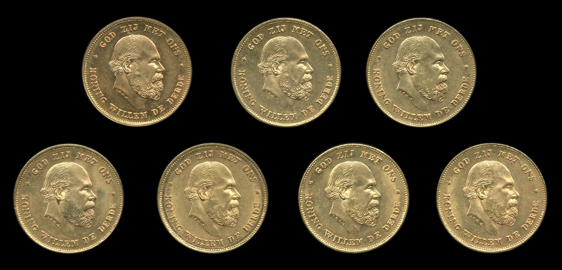 NEDERLAND, 7 x Gouden 10 Gulden Willem III 1875 (Sch.549), alle zfr.