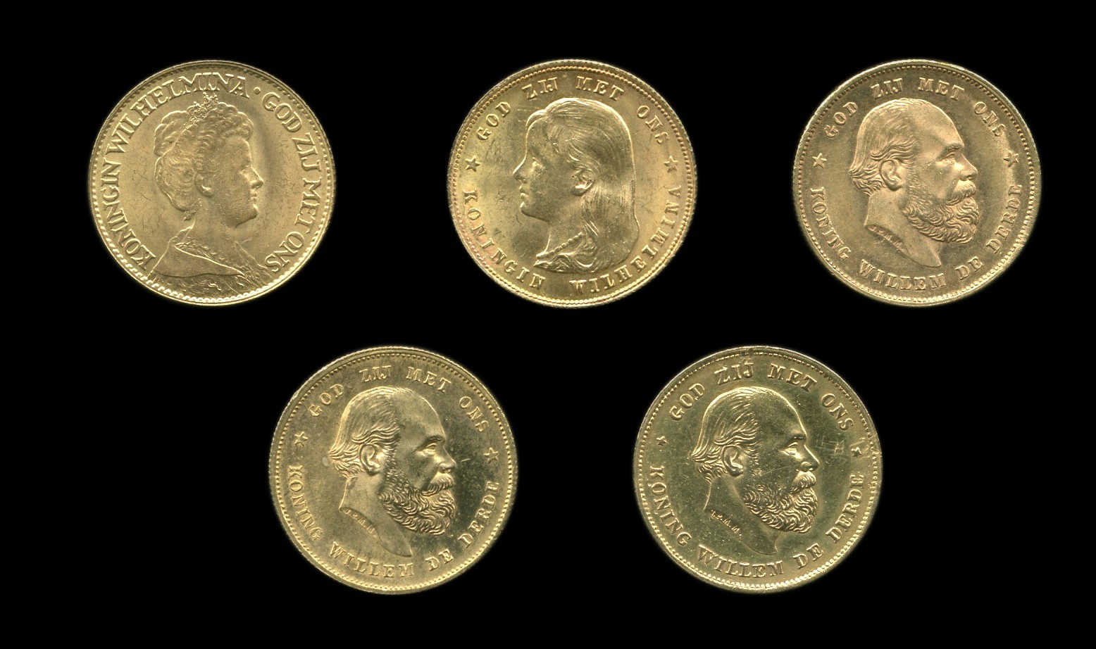 NEDERLAND, 5 x Gouden 10 Gulden, Willem III 1875, 1876 en 1877, alsmede Wilhelmina 1897 en 1917, alle zfr./pr.