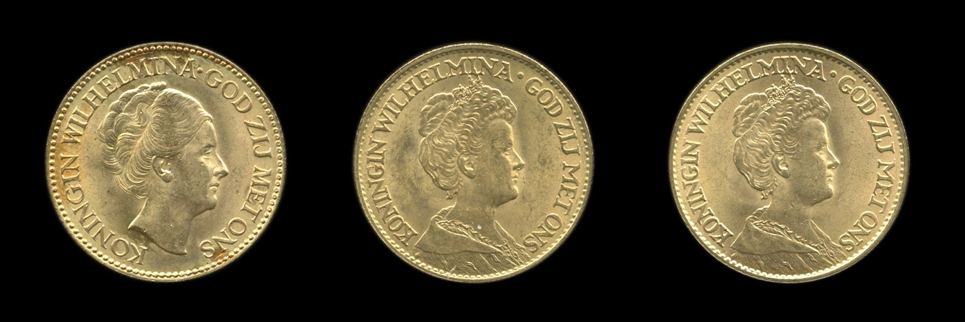 NEDERLAND, 3 x Gouden 10 Gulden Wilhelmina 1912, 1913 en 1925, alle zfr./pr.