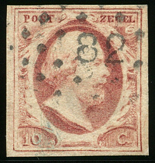 Puntstempel 82 van Nijmegen op 10 cent nr. 2g-Pl.IV-6 (EY.750). Vrijwel prachtex. met zeer mooie afst. Uit veiling 563, kavel 3375. Enig bekende ex. (Jans, blz. 282)