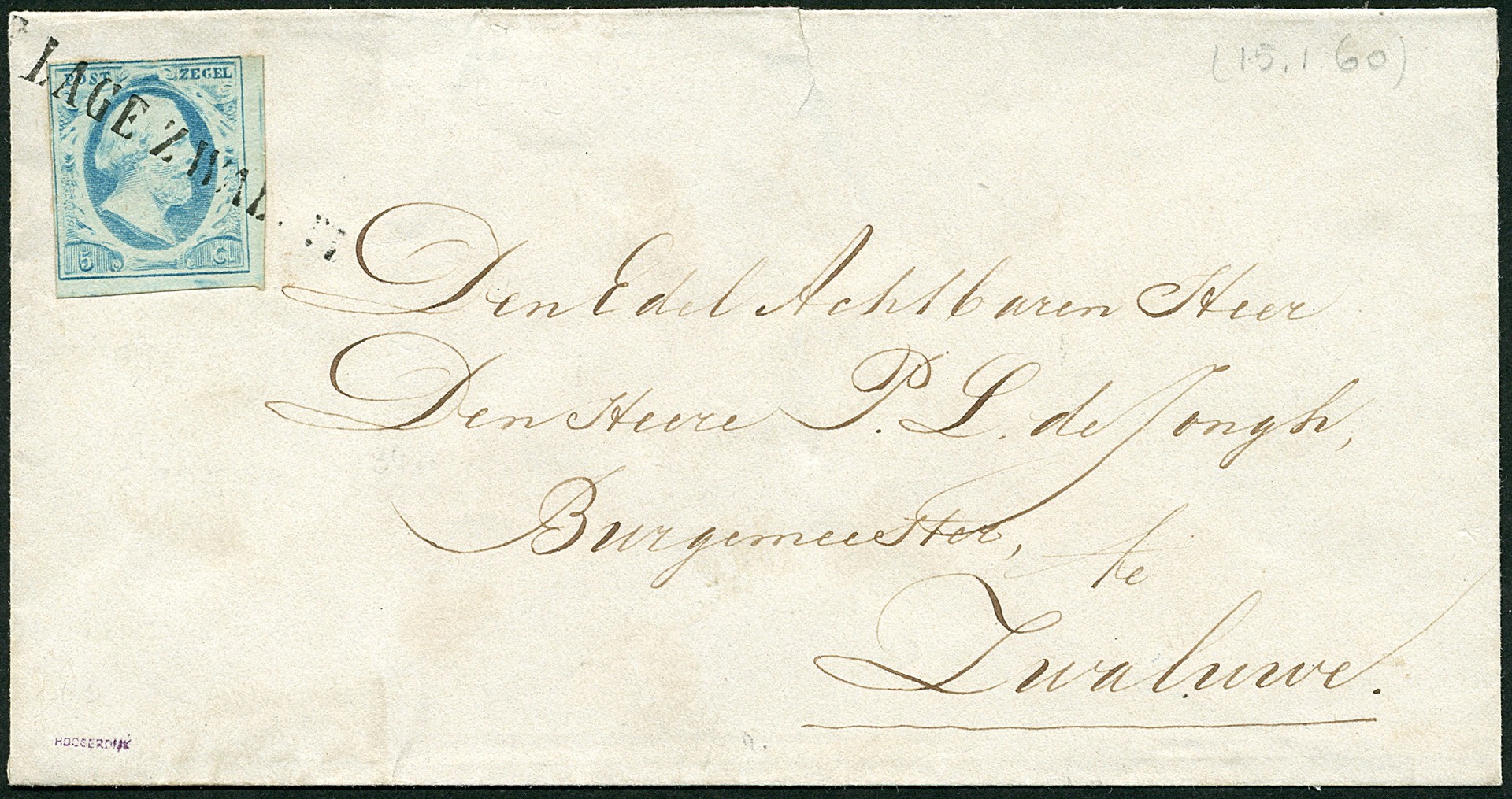 DE LAGE ZWALUVE (EY.500) op 5 cent. Nagenoeg prachtex. (links en boven louperand) met diagonale afst. op aan de az. wat ruw geopend fris couvert, met op vz. in potlood geschreven datum 15.1.60 naar de burgemeester van Zwaluwe. Op az. blauwe afdruk van naamstempel DE MOERDYK. Keur ´Hoogerdijk´