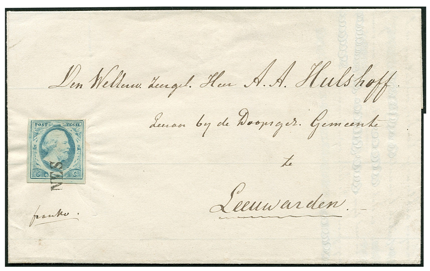 NES (EY.100) op 5 cent. Prachtex. op zeer frisse, dichtgeplakte vouwbrief van 10(?)-2-1860 naar Leeuwarden. Keur ´Van Dieten´. Ex de Veer