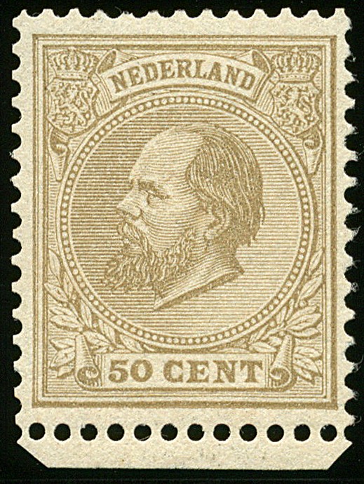 27L, 50 cent geelbruin, Kt.12½ gr.g., postfris prachtex. met ondervelrandje, groen keurstempeltje Ned. Bond en 2 originele geelbruine gomstreepjes. Fris zegel zonder gebreken met cert. Vleeming (2015) € 6025