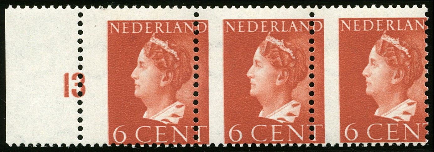 333, 6 cent met verticale misperforatie, postfrisse prachtstrip van drie met velrand