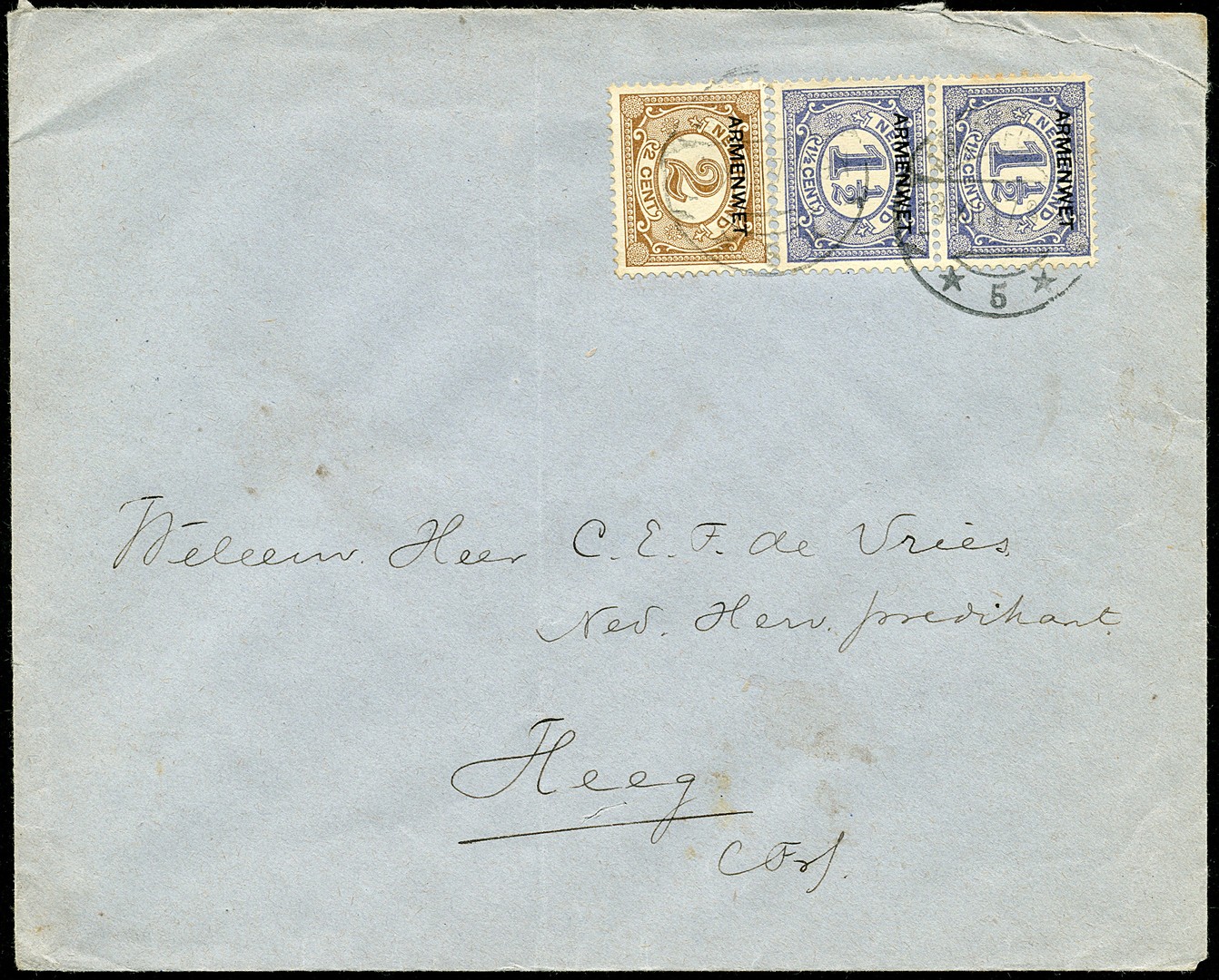 2/3, Armenwet 1½ cent in paar en 2 cent op envelop (dus geen Armenwetcouvert) van Amersfoort 3-12-1917 naar een predikant te Heeg 5-12, als aardige Sinterklaasverrassing