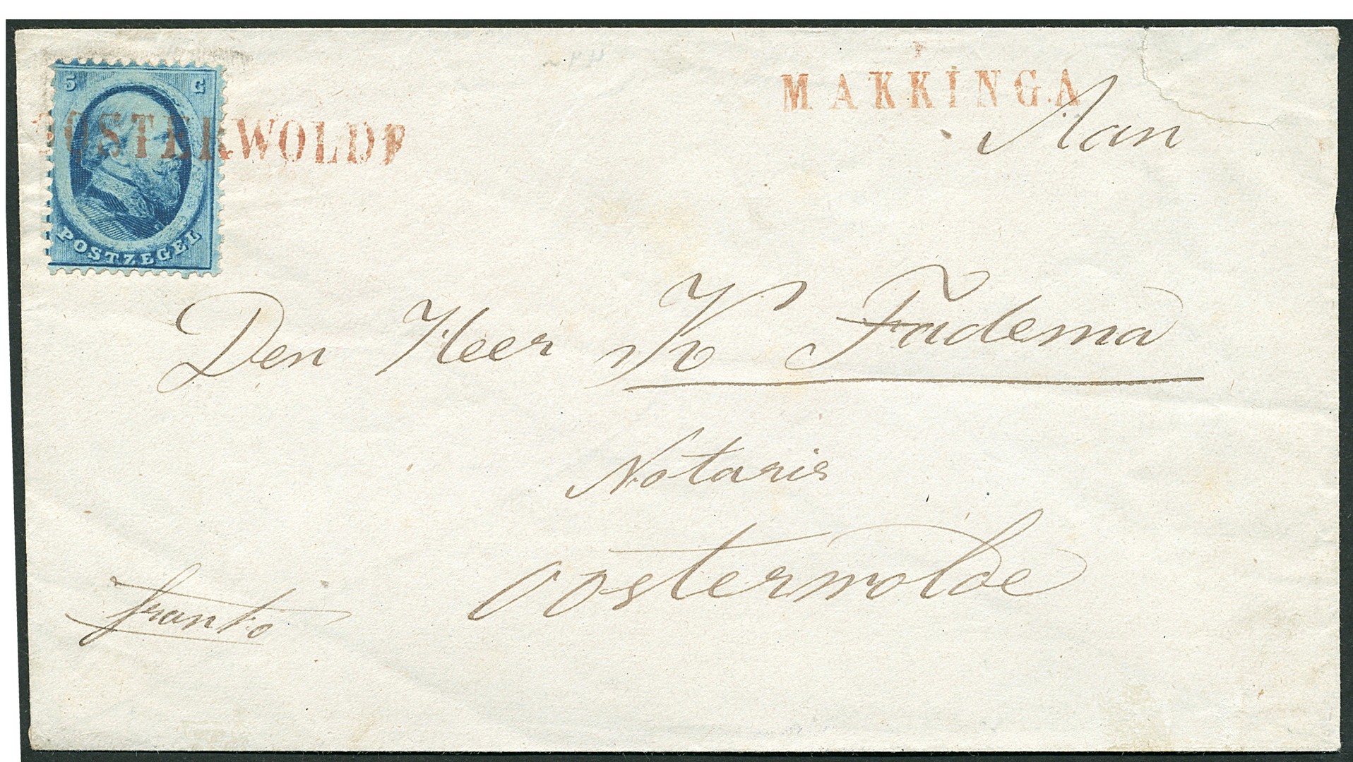 Naamstempel OOSTERWOLDE in rood op 5c nr. 4. Prachtex. op frisse, ongedateerde envelop (rechtsboven onbeduidend scheurtje), waarschijnlijk van Makkinga (rood naamstempel) naar Oosterwolde