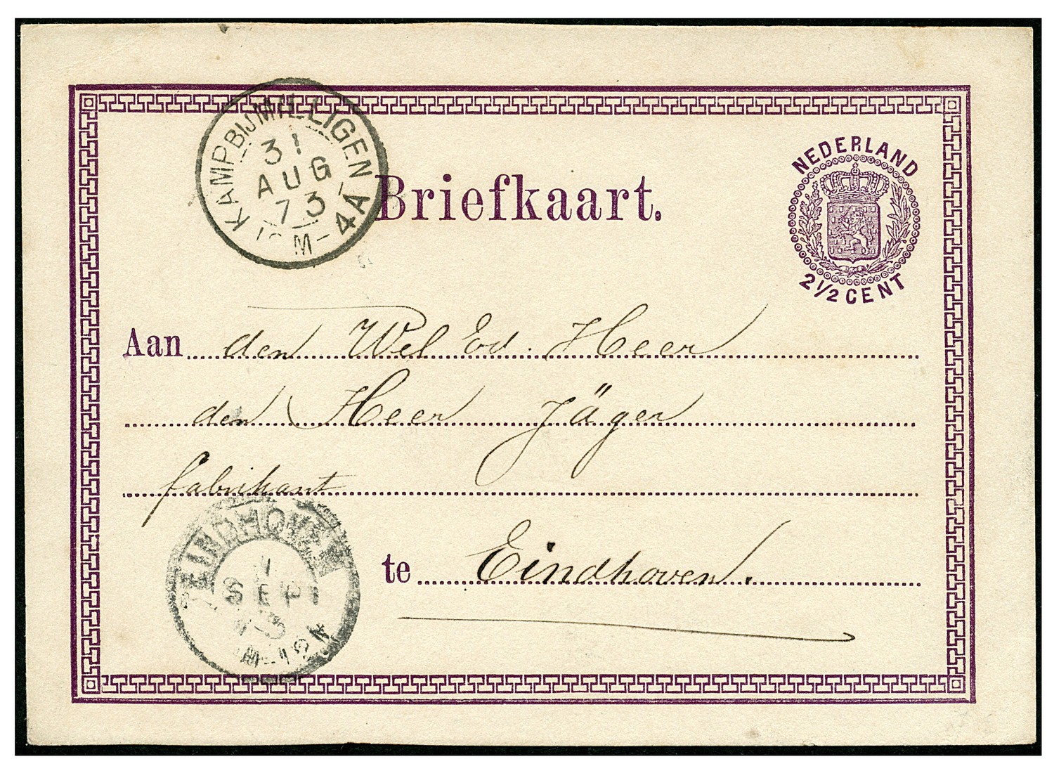 Militaria. Luxe afdruk van tweeletterstempel KAMP BIJ MILLIGEN 31-8-1873 op bk. G3 naar Eindhoven 1-9