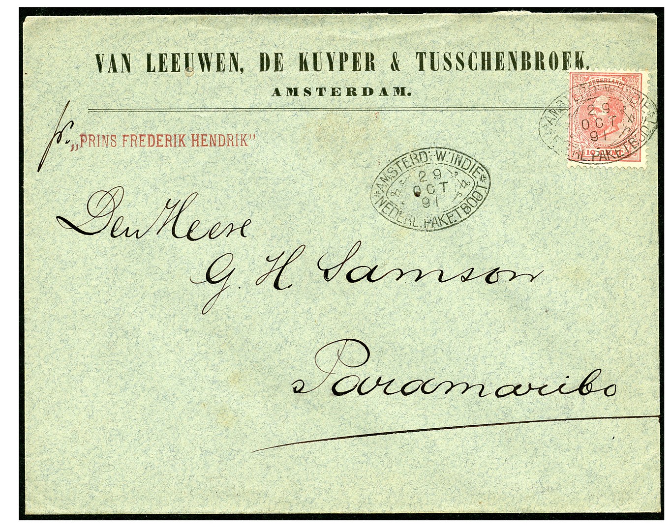 Firmacouvert gefr. met 10c nr. 21 afgest. met ovaal KWIM-stempel 29-10-1891 per ´Prins Frederik Hendrik´ naar Paramaribo 29-10. Luxe kwaliteit