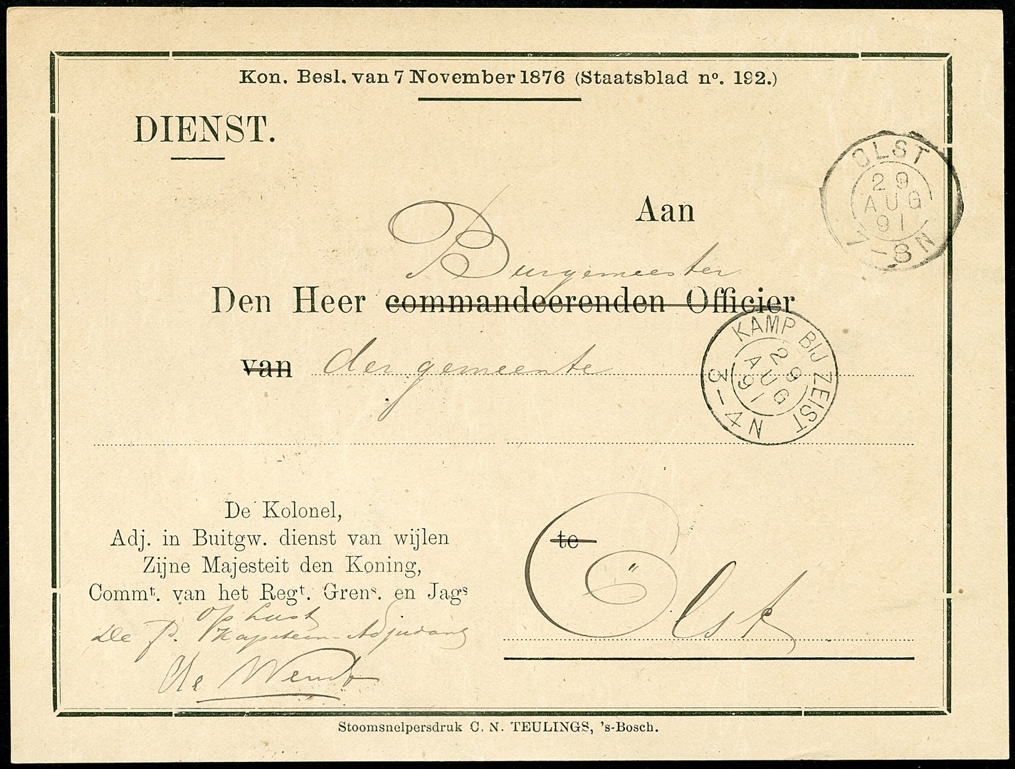 Militaria. Superbe afdruk kleinrond KAMP BIJ ZEIST 29-8-1891 op dienstbk. naar Olst 29-8