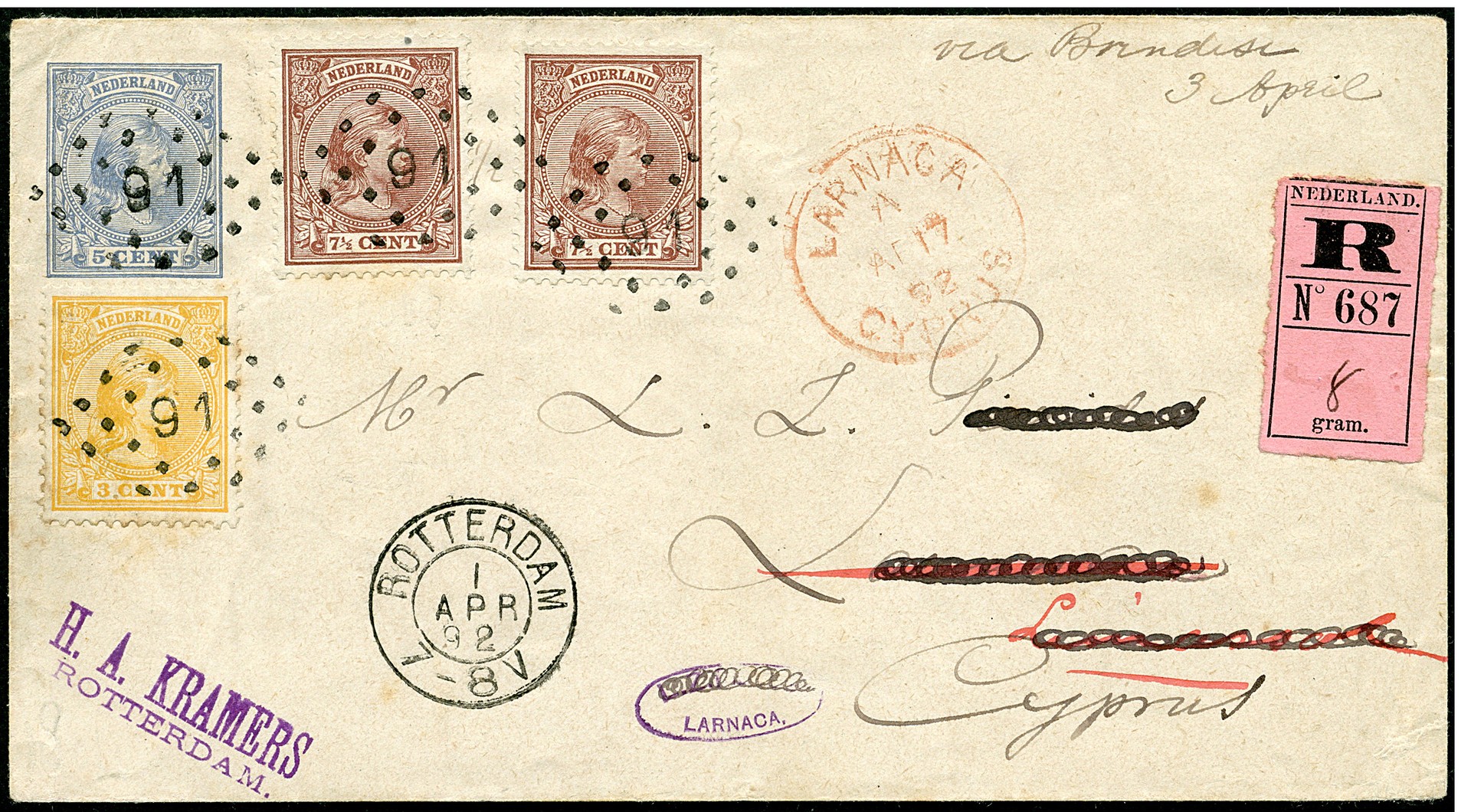 Env. G5 met bijfrankering 3 cent en 2 x 7½ cent, aangetekend van Rotterdam 1.4.92 naar Larnaca-Cyprus 17.4, helaas met doorgehaald adres, ov. prachtex.