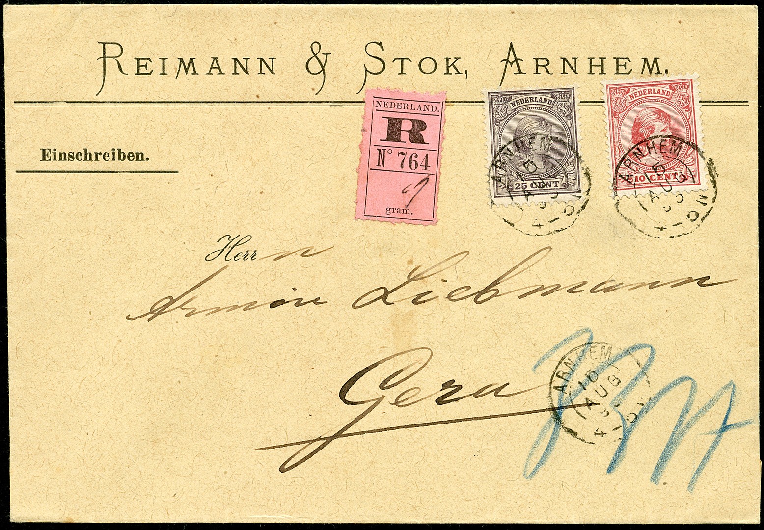 Firmacouvert gefr. met 10c donkerkarmijn en 25c dofviolet van Arnhem 15-8-1893 aangetekend naar Gera (D) 16-8