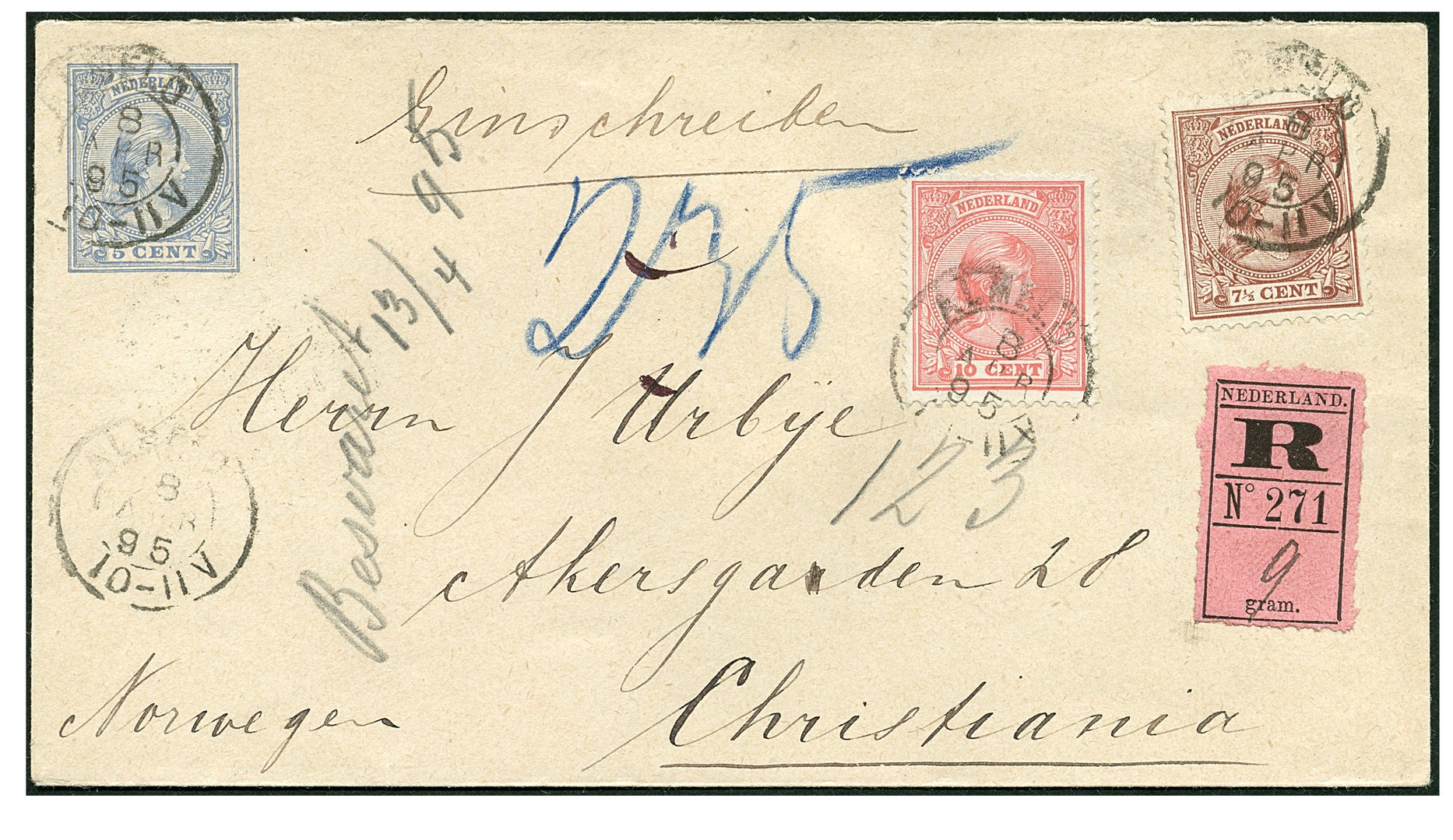 Env. G5 van 9 gram bijgefr. met 7½c nr. 36 en 10c nr. 37 van Almelo 8-4-1895 aangetekend naar Christiana, Noorwegen, 10-4. Prachtig Hangend Haar-poststuk met op az. mooi lakzegel, naar schaarse bestemming!