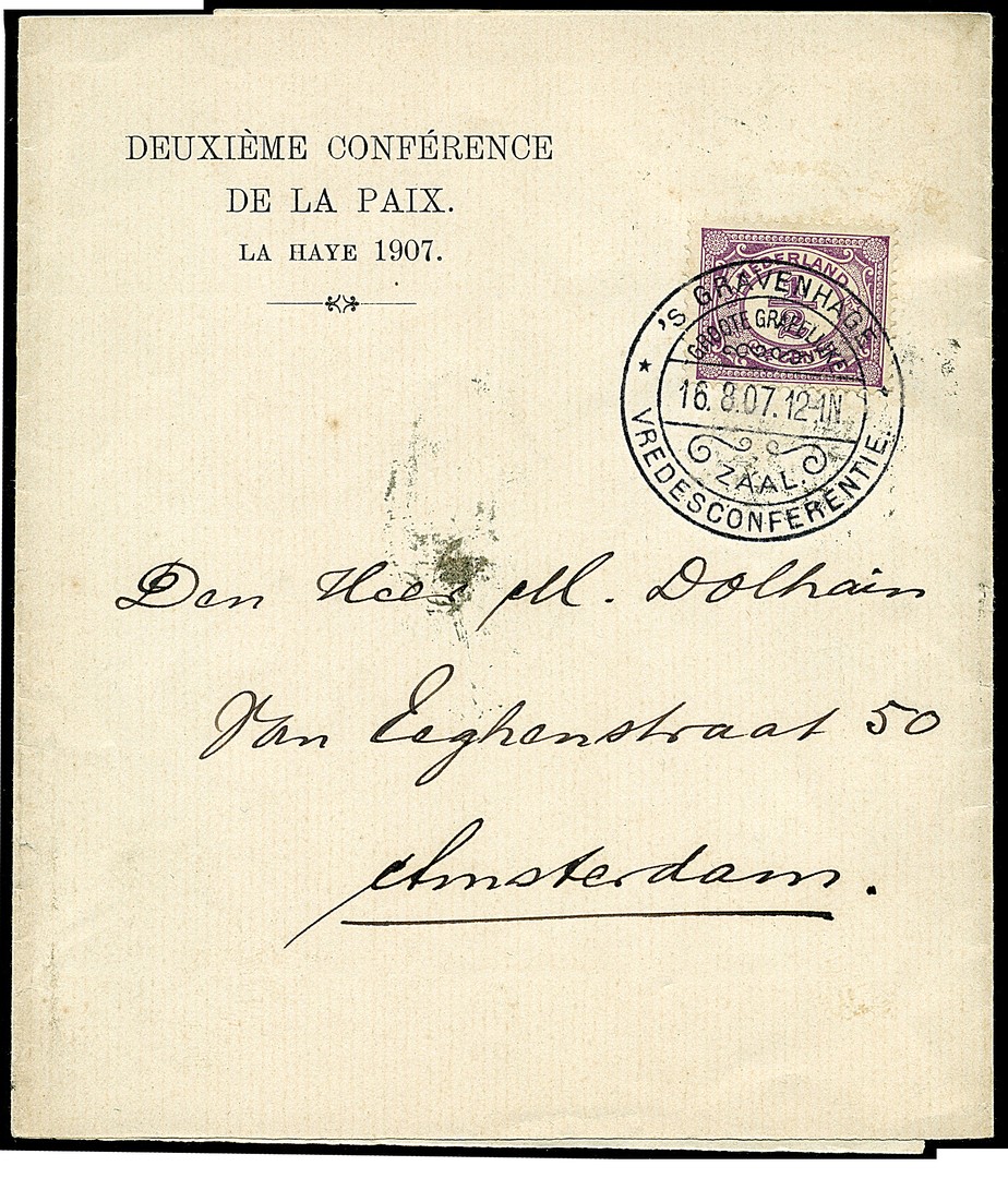 Omslagbandje van de Deuxième Conférence de la Paix gefr. met ½c nr. 50 afgest. met speciaal stempel (V.160) van ´sGravenhage 16-8-1907 naar Amsterdam. Tevens dit stempel op prentbk. naar Zwitserland (niet-filatelistisch!) en op prentbk. lokaal verz. Prachtige afdrukken!