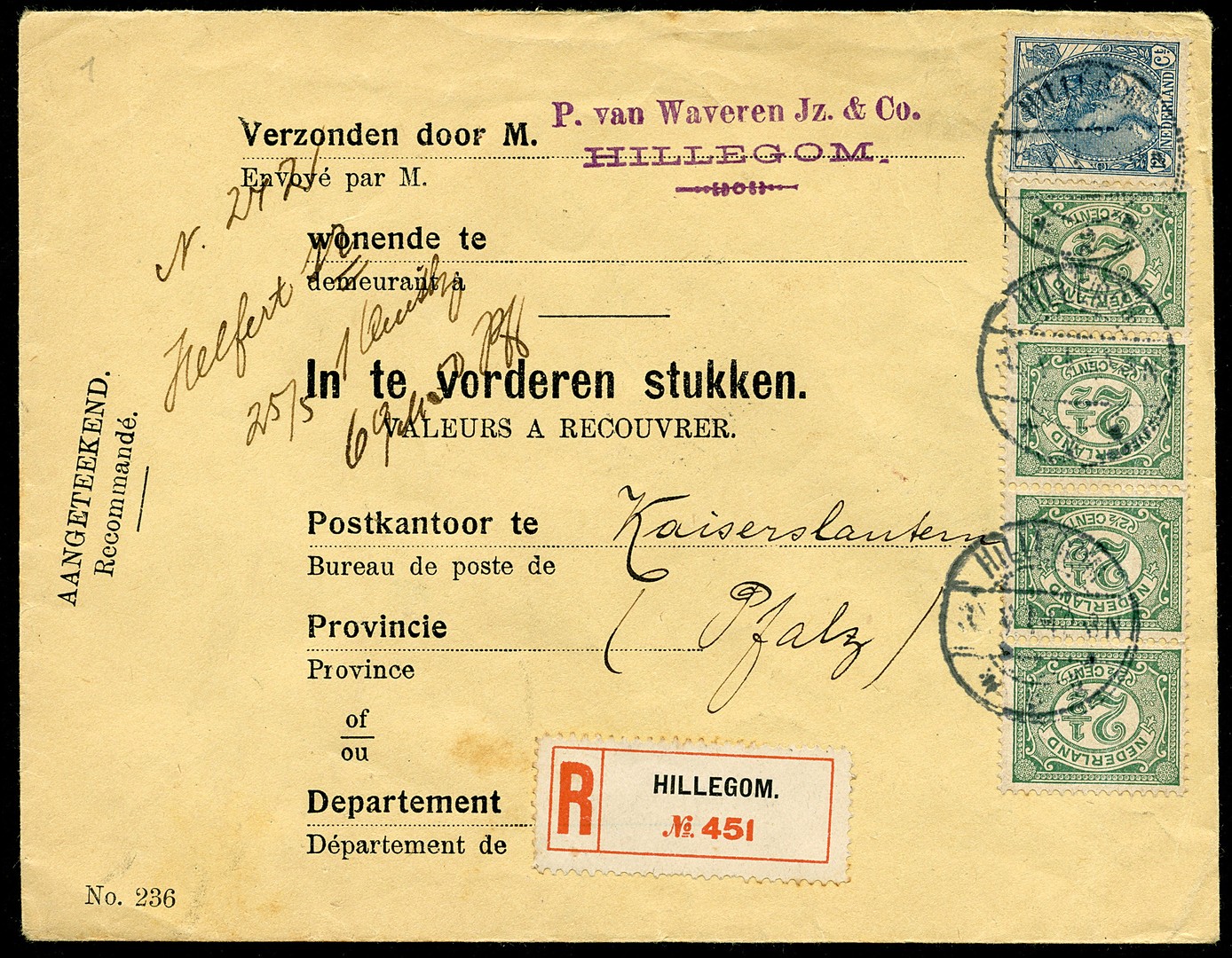 Couvert voor ´In te vorderen stukken.´ gefr. met 4x 2½c en 12½c van Hillegom aangetekend naar Kaiserslautern 23-5-1914