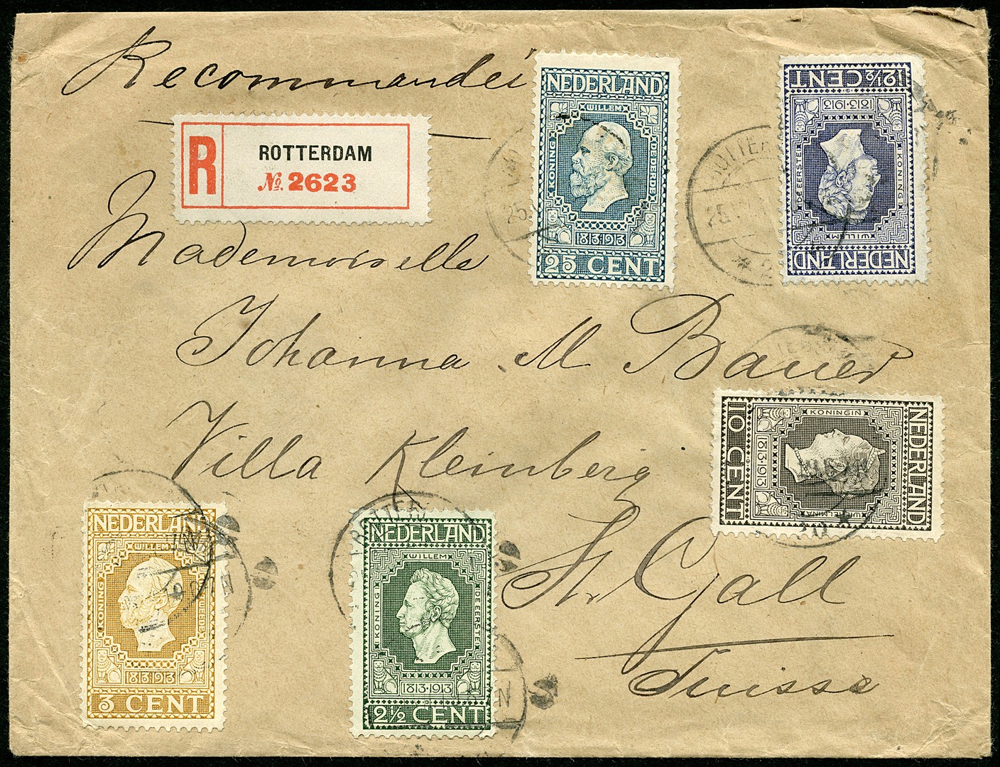 Couvert prachtig gefr. met Jubileum 1913-zegels van 2½c, 3c, 10c, 12½c en 25c van Rotterdam 25-7-1919 aangetekend naar een villa te St. Gallen, Zwitserland, 28-7