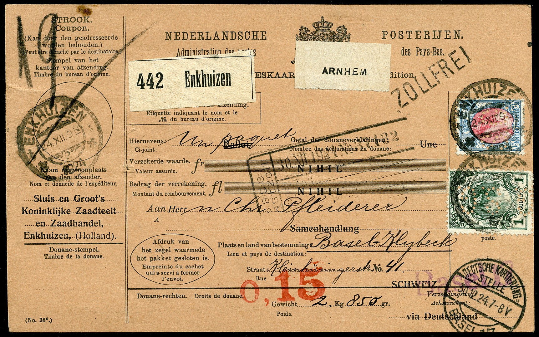 Perfin. Adreskaart gefr. met Bontkraag 15c nr. 65 en 1 gld nr. 77D, beide zegels met firmaperforatie ´S.G.´ van zaadhandel Sluis & Co. voor een pakket van Enkhuizen 24-12-1924 over Arnhem en Emmerich 29-12 naar Basel 30-12
