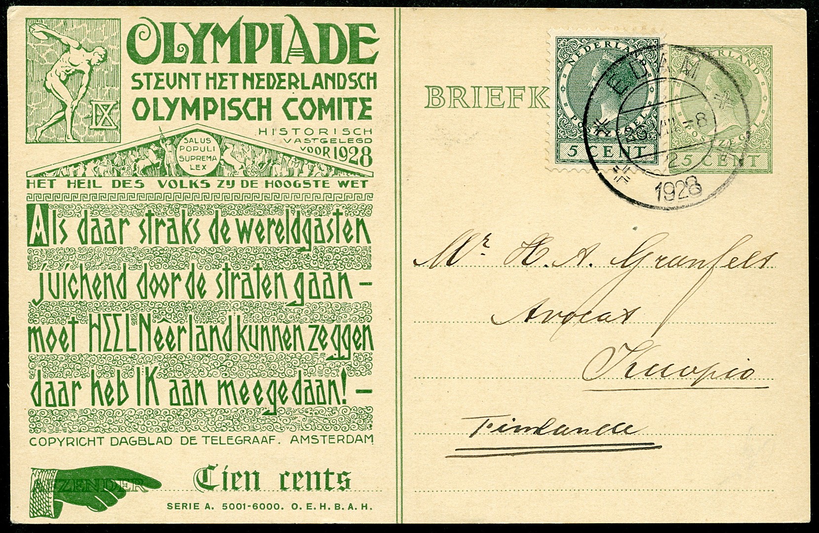Particulier bedrukte bk. Olympiade 1928, OL14. Prachtkaart bijgefr. met 5c van Edam 26-8-1928 naar een advocaat in Finland