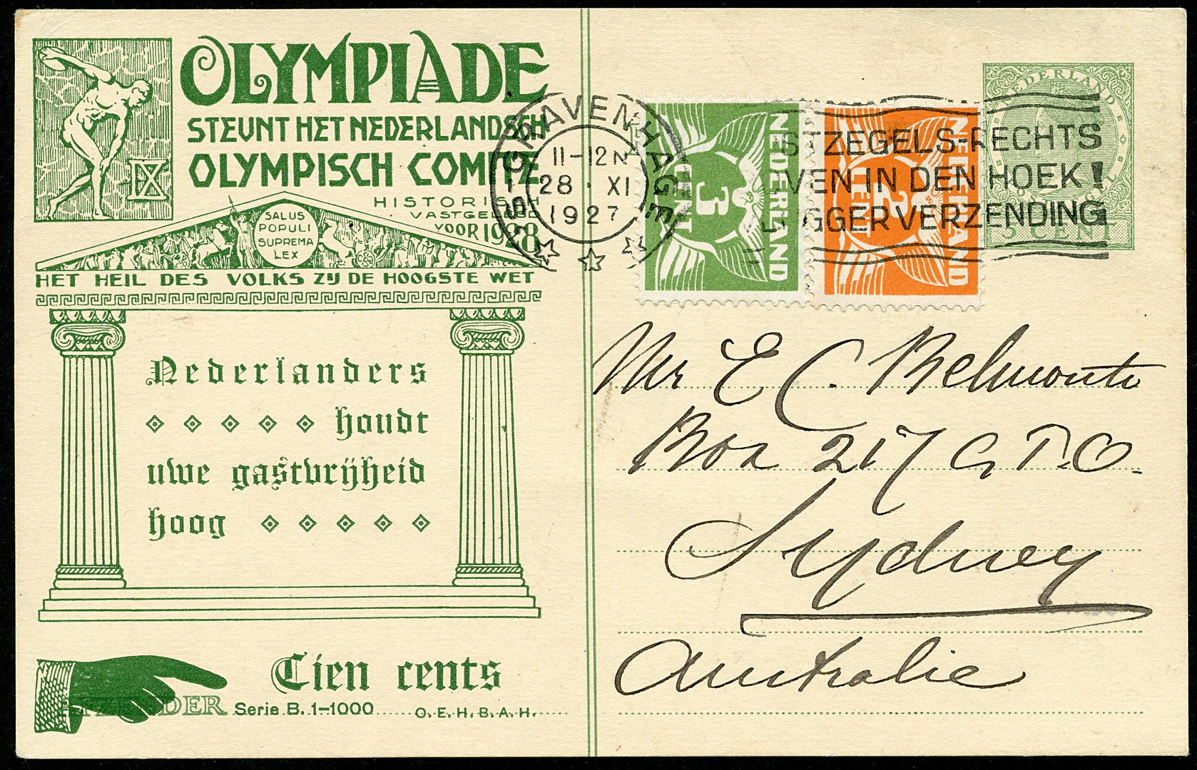 Particulier bedrukte bk. Olympiade 1928, OL18. Prachtkaart bijgefr. met 2c en 3c van ´s-Gravenhage 28-11-1927 naar Sydney (az. onbeschreven)