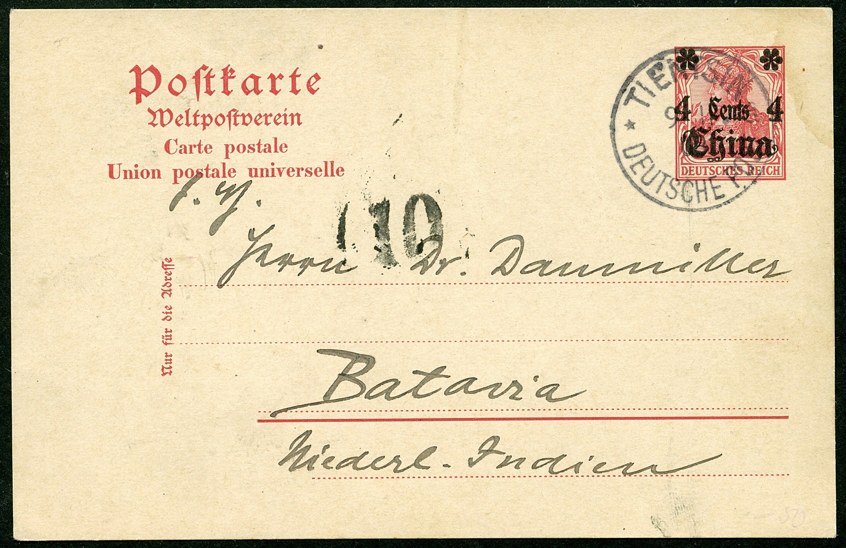 DUITSLAND. Duits postkantoor in Tientsin, China. Bk. van 4c op 9-11-1908 naar Batavia, met bestellersstempel 10