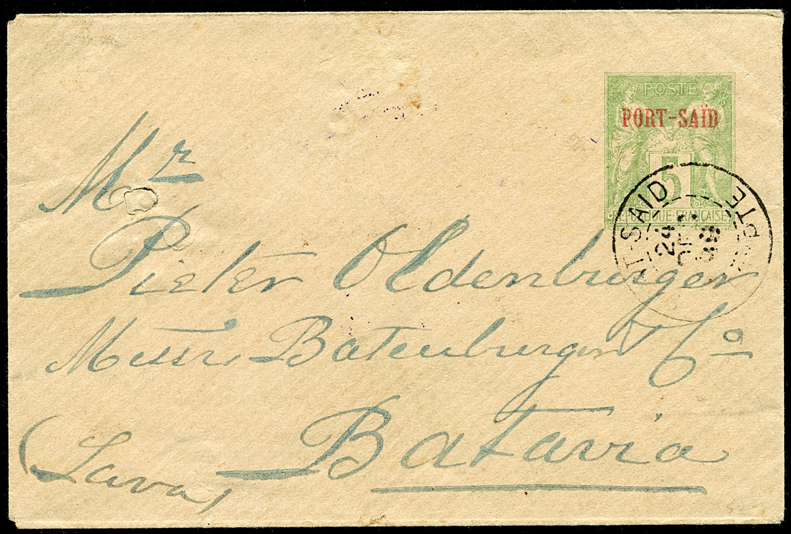 FRANS POSTKANTOOR IN PORT-SAÏD. Env. van 5c op 24-12-1899 via Colombo naar Batavia 16-1-1900. Schaars en vroeg gebruikt poststuk!